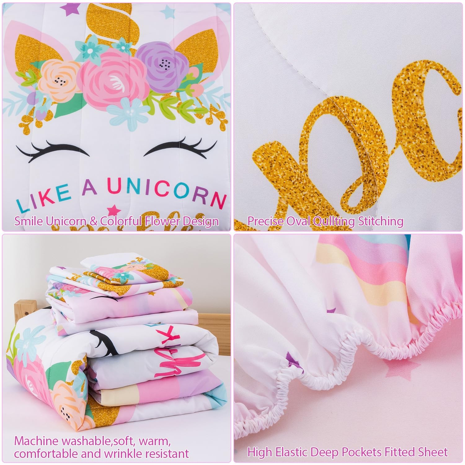 Toddler Comforter for Girls,5 Piece Bed in A Bag 3D Unicorn Sparkle Theme Bed...