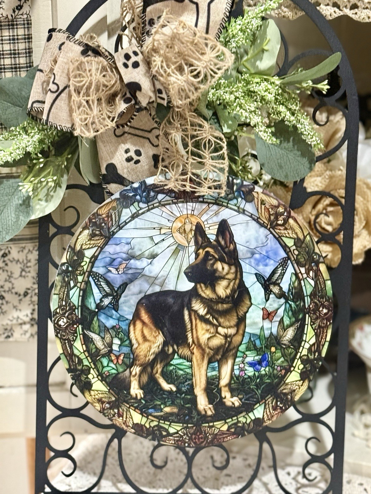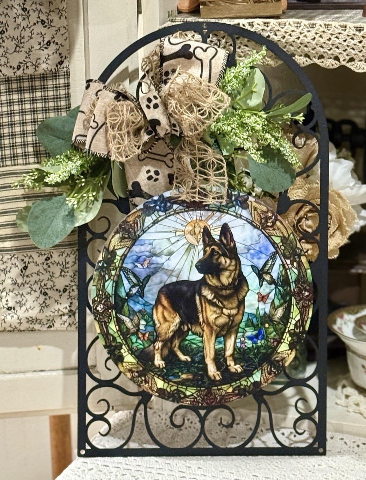 Handcrafted German Shepherd Welcome Wall Decor , 9x16 , Wood Burlap, Light