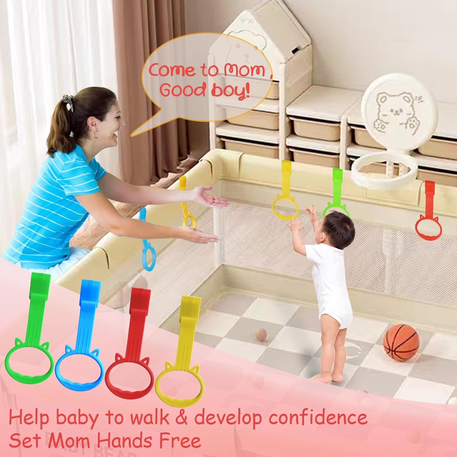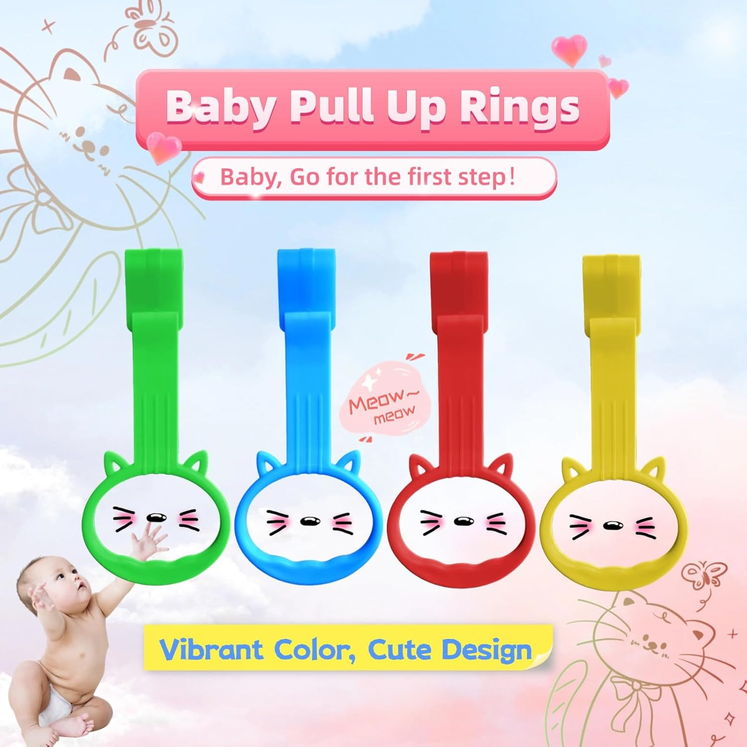 4Pack Baby Pull up Rings for Baby Playpen Walker, 4 Color Cute Design