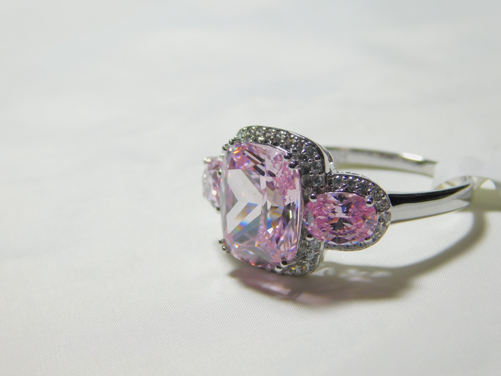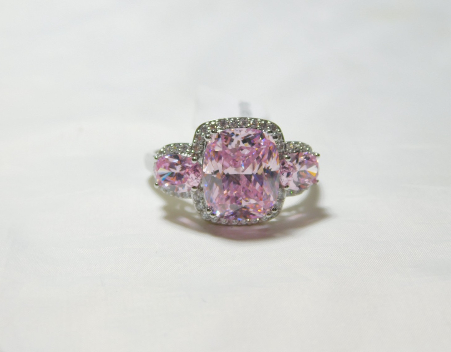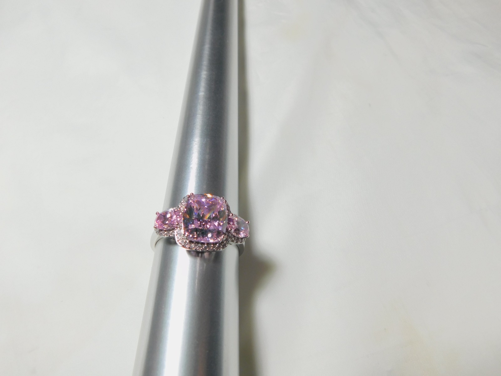как выглядит Elegant Pink Lab Created Sapphire-Three-Stone Ring Sterling Silver Ring R1340 фото