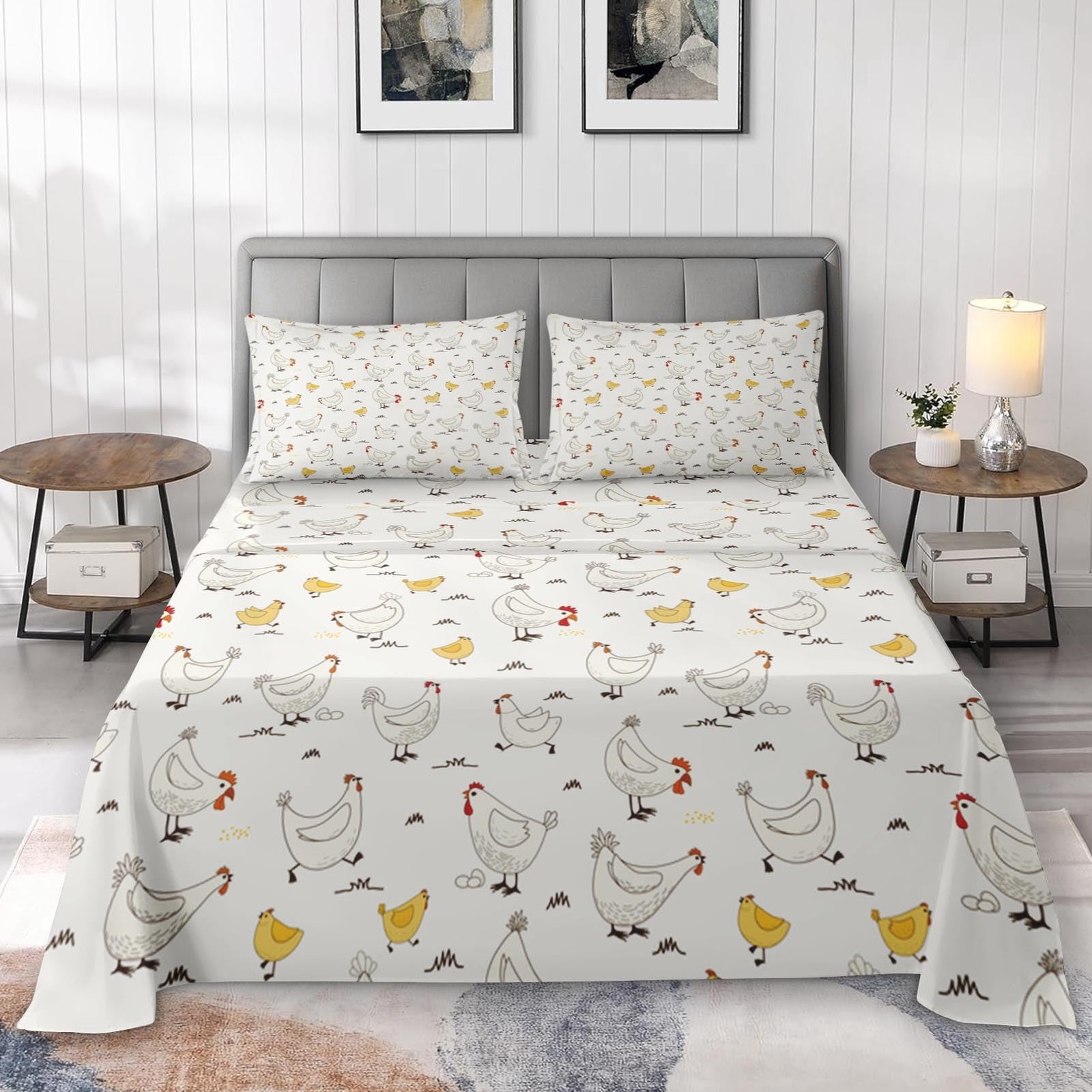 Queen Size Bed Sheet Sets, Chicken Animal Farm 4 Pcs Bedding Sets for Kids an...
