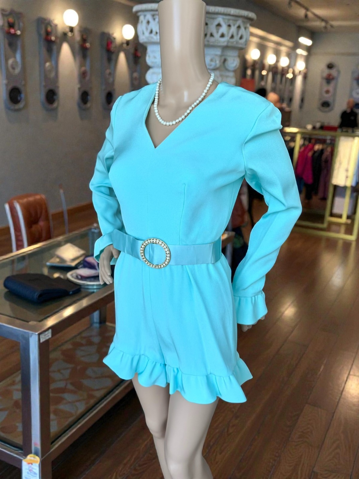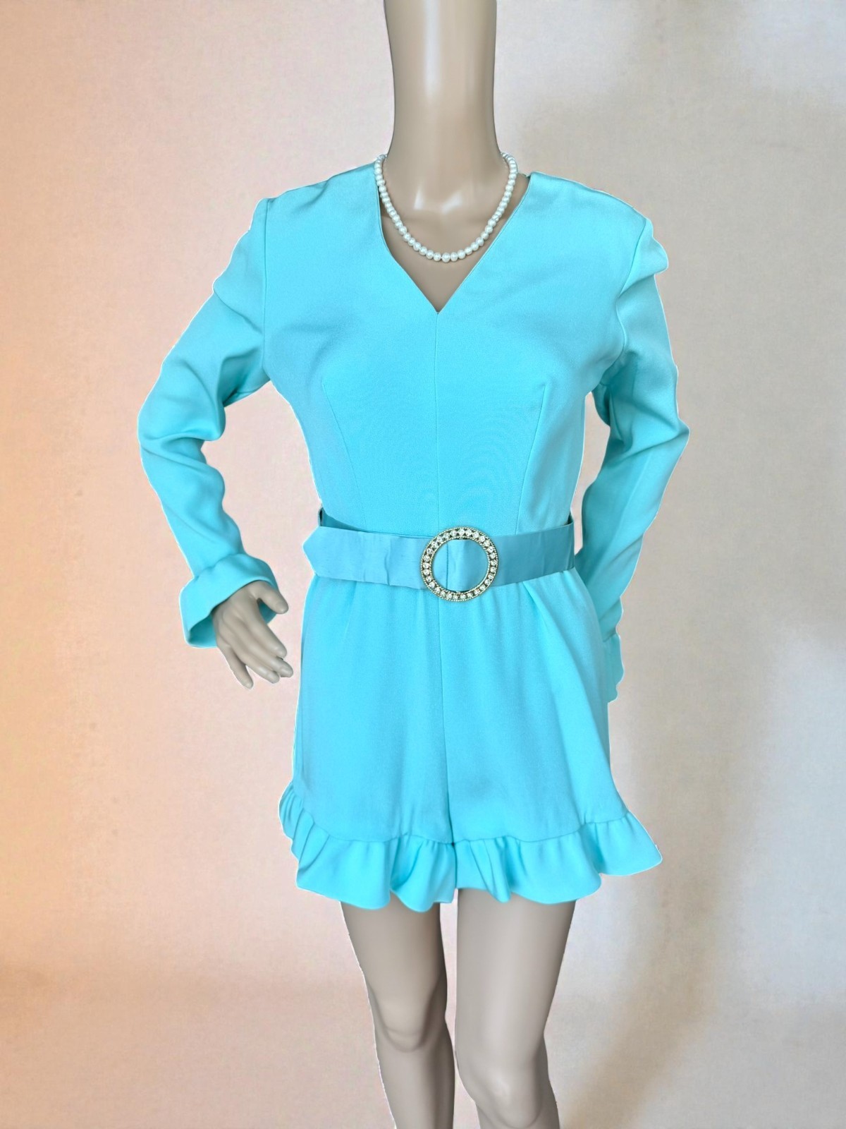 как выглядит Vintage 70s Turquoise Blue Belt Romper Shorts Hot Pants Ruffle Edges S фото