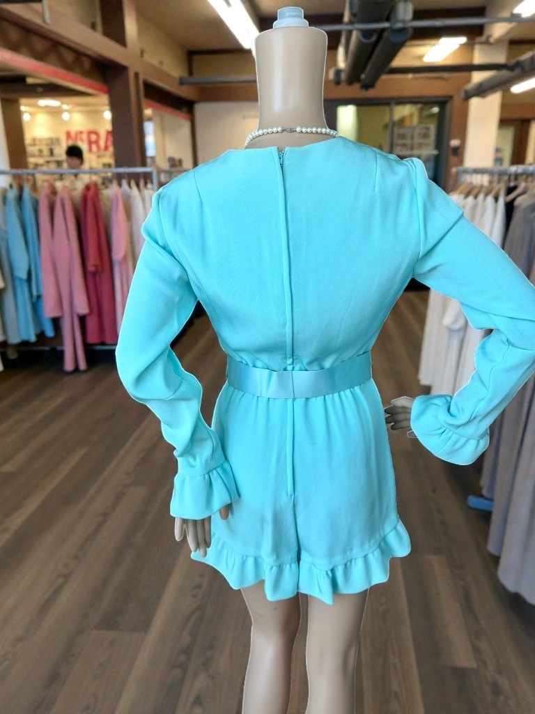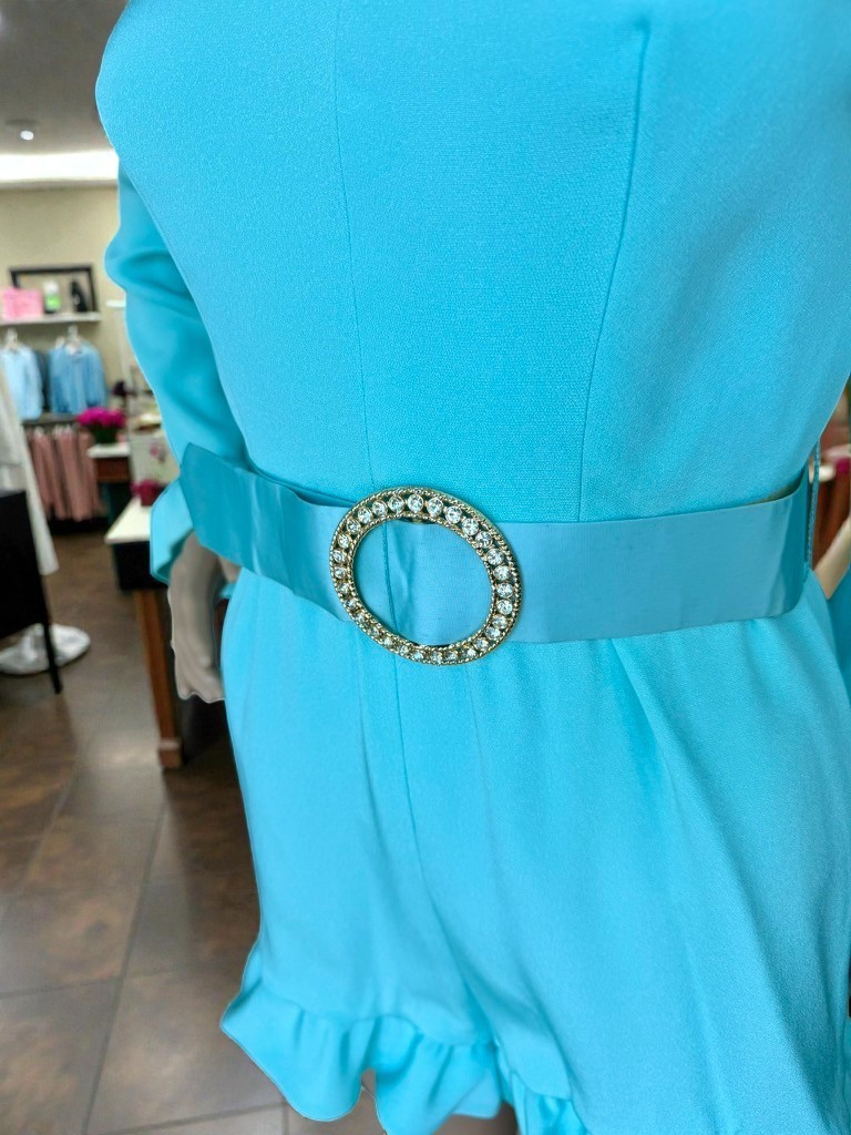 Vintage 70s Turquoise Blue Belt Romper Shorts Hot Pants Ruffle Edges S