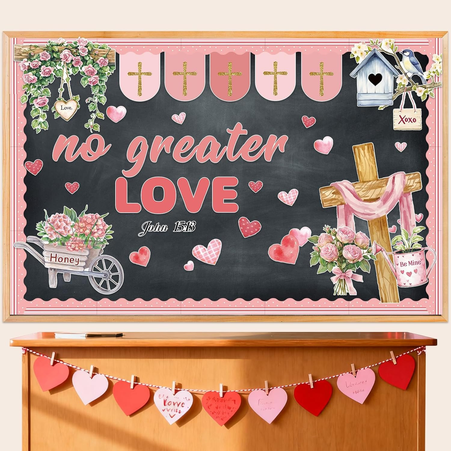 как выглядит Valentines Christian Bulletin Board Set - 75 Pcs with John 15:13 Decor фото