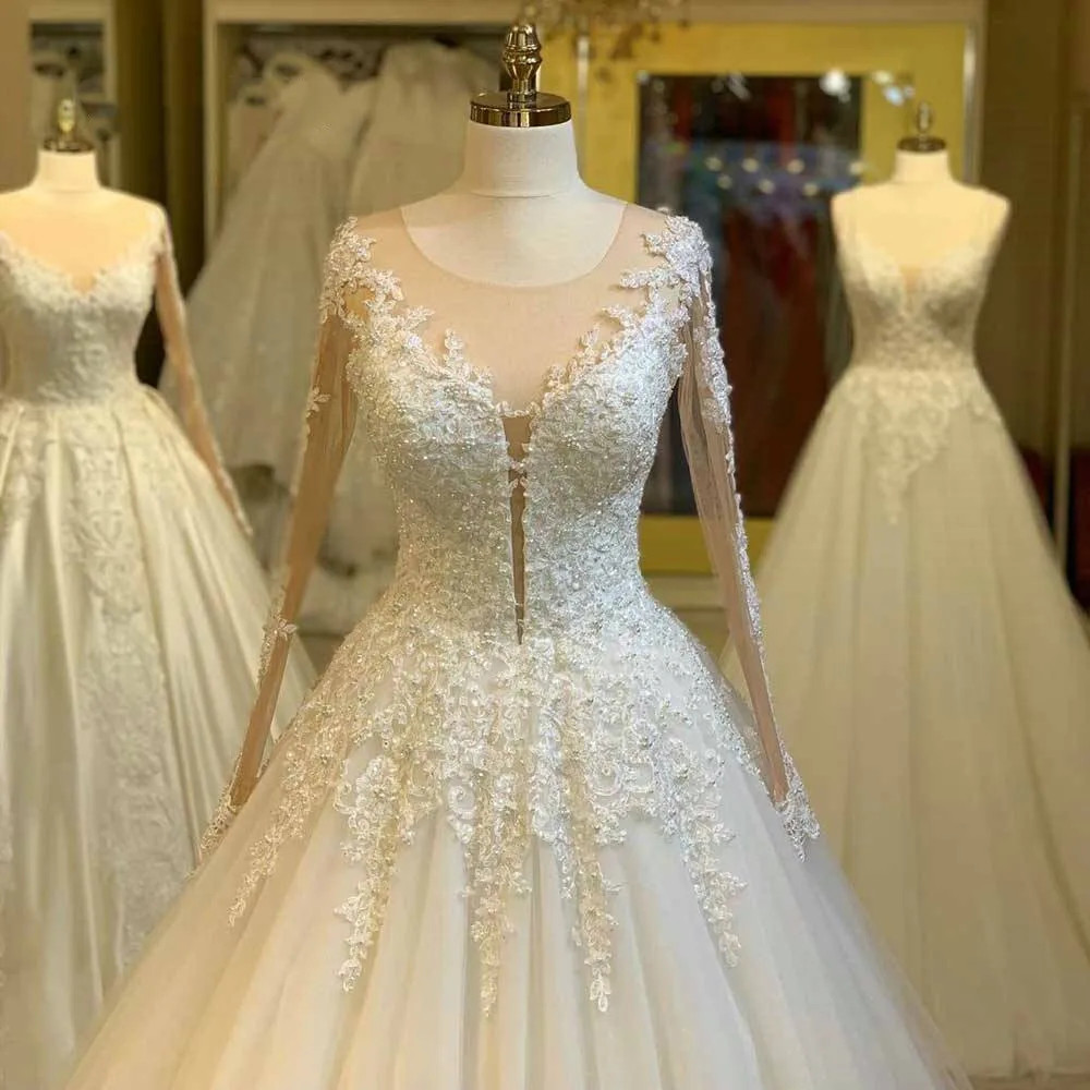 как выглядит Luxury A-Line Wedding Dresses Scoop Neck Long Sleeves Lace Applique Bridal Gowns фото