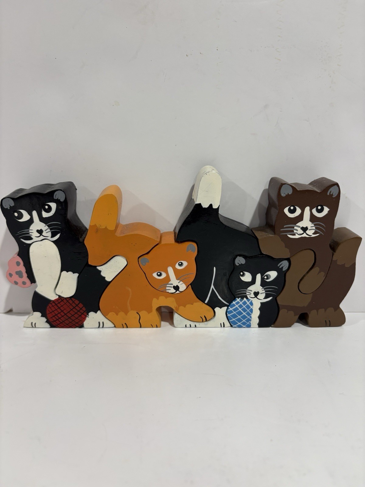 Vintage Wood Cat Zigsaw Puzzle Blocks Hand Painted Wooden Block Cats Kitty