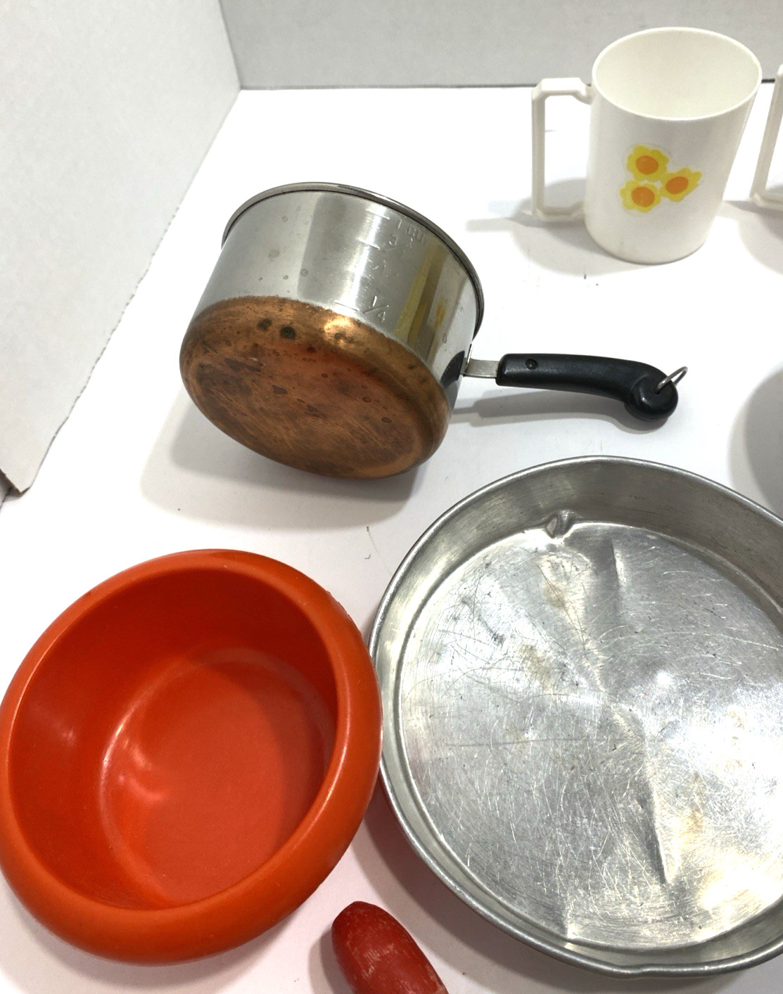 Vintage 50-70s Play Toy Bakeware Aluminum Wood Rolling Pin Cake Pans Coffee/Cups
