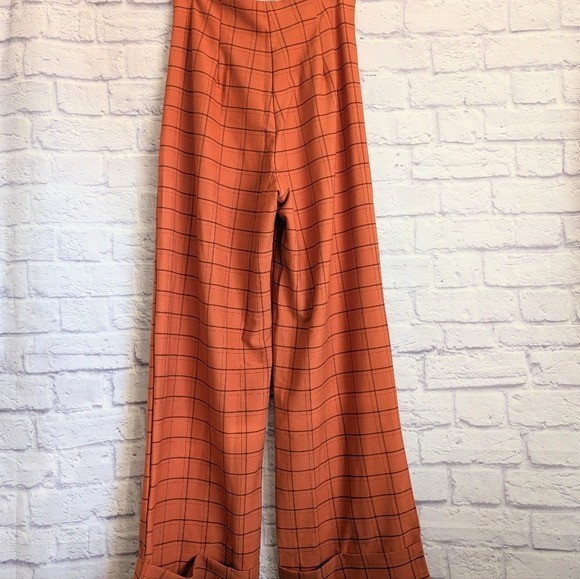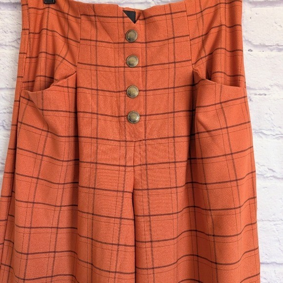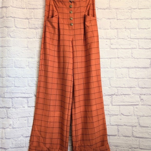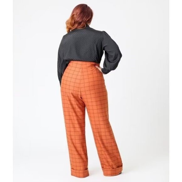 Unique Vintage High Waist Wide Leg Pants M NEW Orange Black Plaid 1940s Pin Up