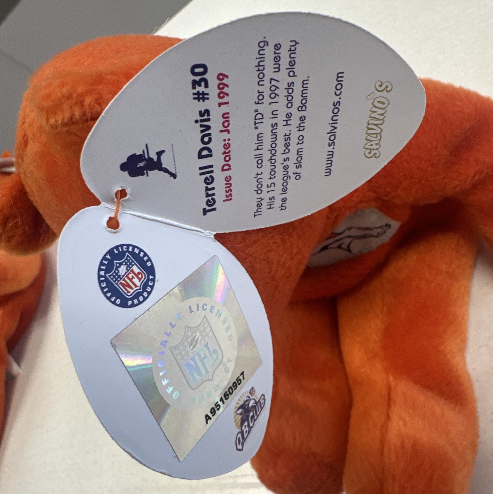 • VTG Terrell Davis Beanie Bear Orange 9" Salvinos Bammers NFL Broncos 1999 1963