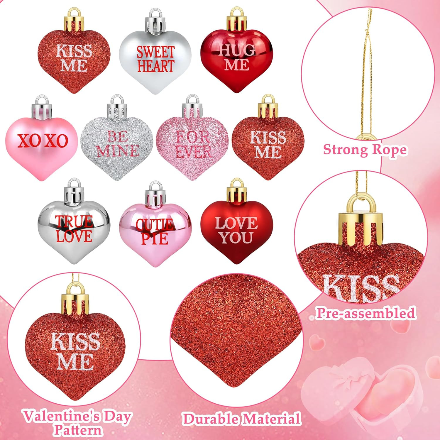 как выглядит 36 PCS Valentines Day Heart Ornaments - Red, Pink, Silver Hanging Decorations фото