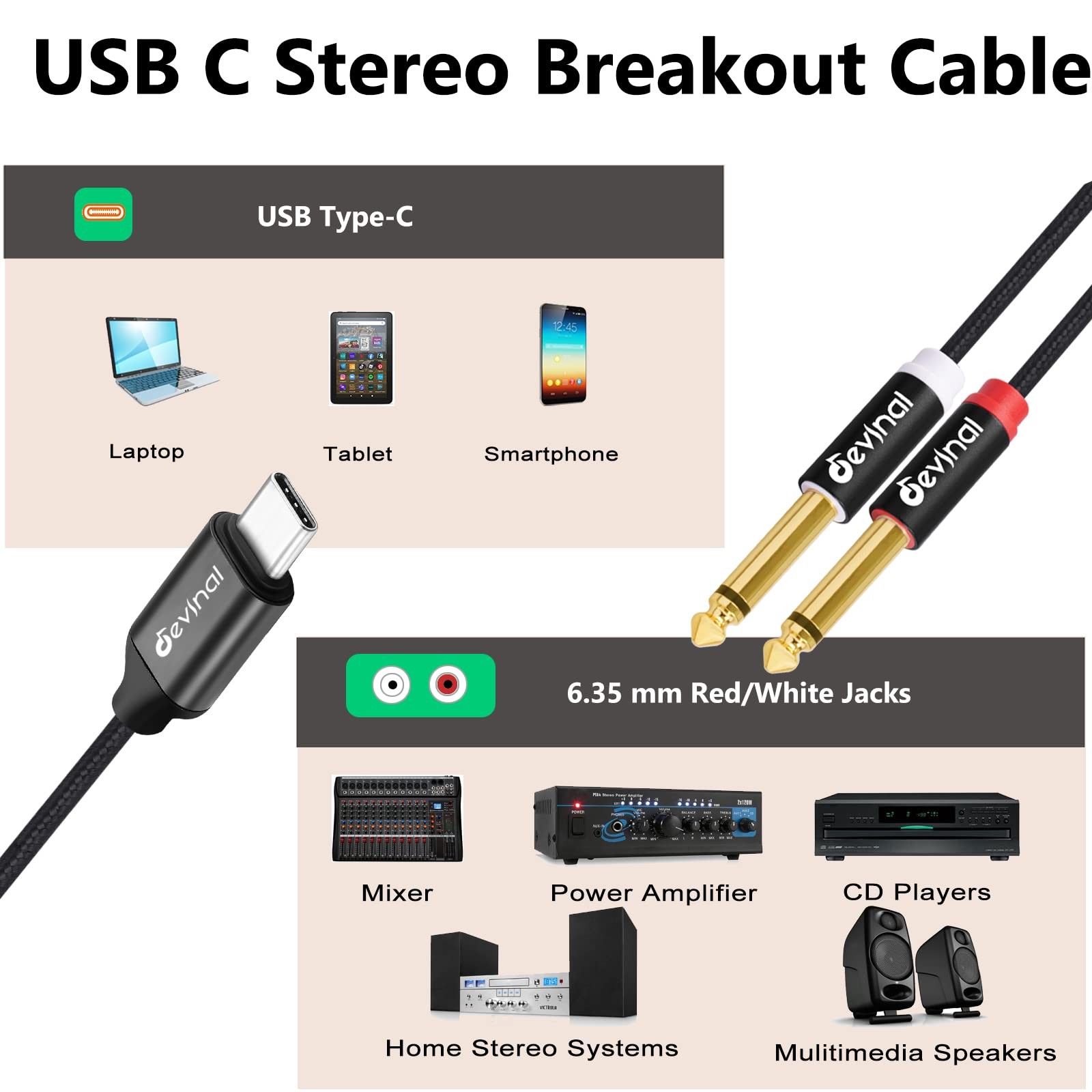 Usb C To 1/4 Inch Audio Cable Type C To Dual 6.35mm Trs Stereo Aux Cord Y Split