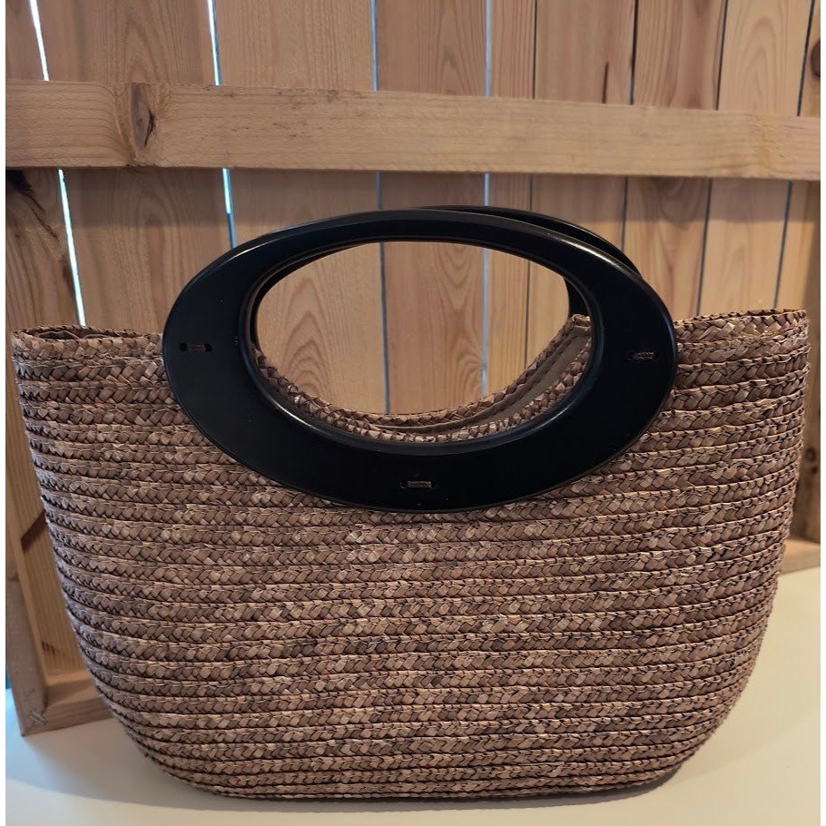 Straw Woven Tote Bag Vintage Oval Wooden Handle Summer Bag