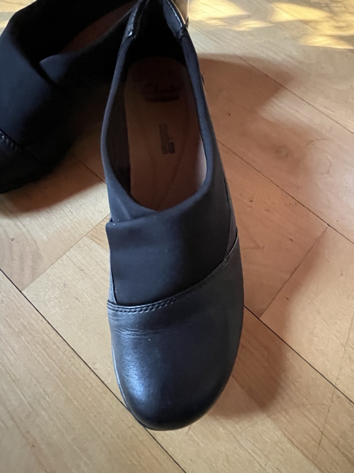 Clarks Women's Channing Black Leather Soft Cushion Slip On Shoes Size 8