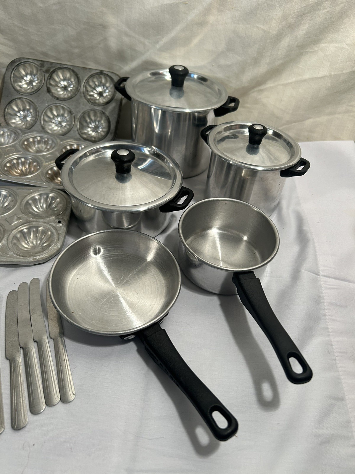 Vintage 45 Piece Kids Kitchen Cookware Baking Toys Aluminum