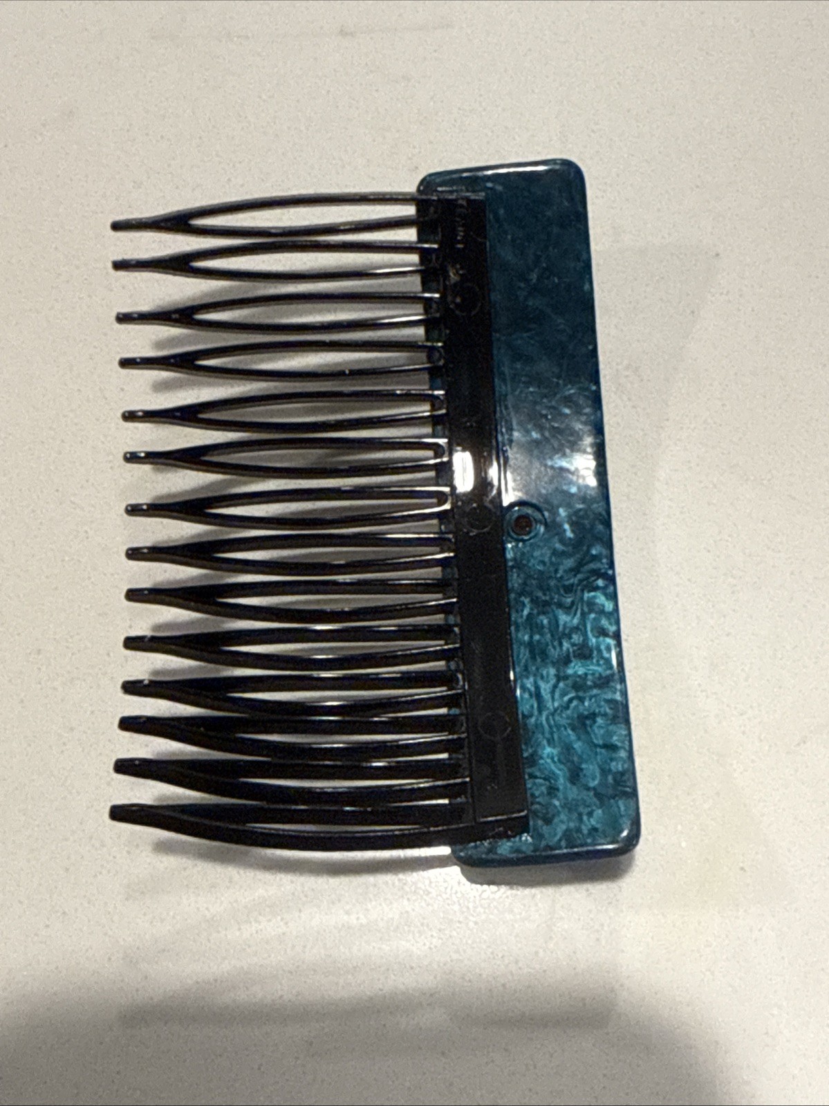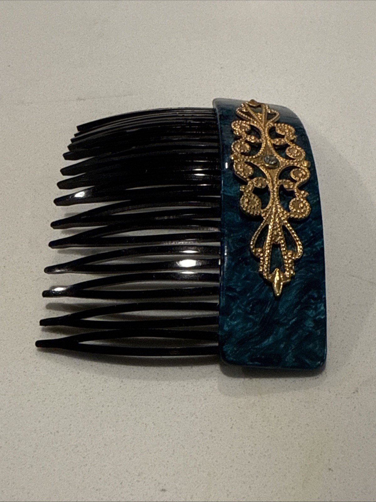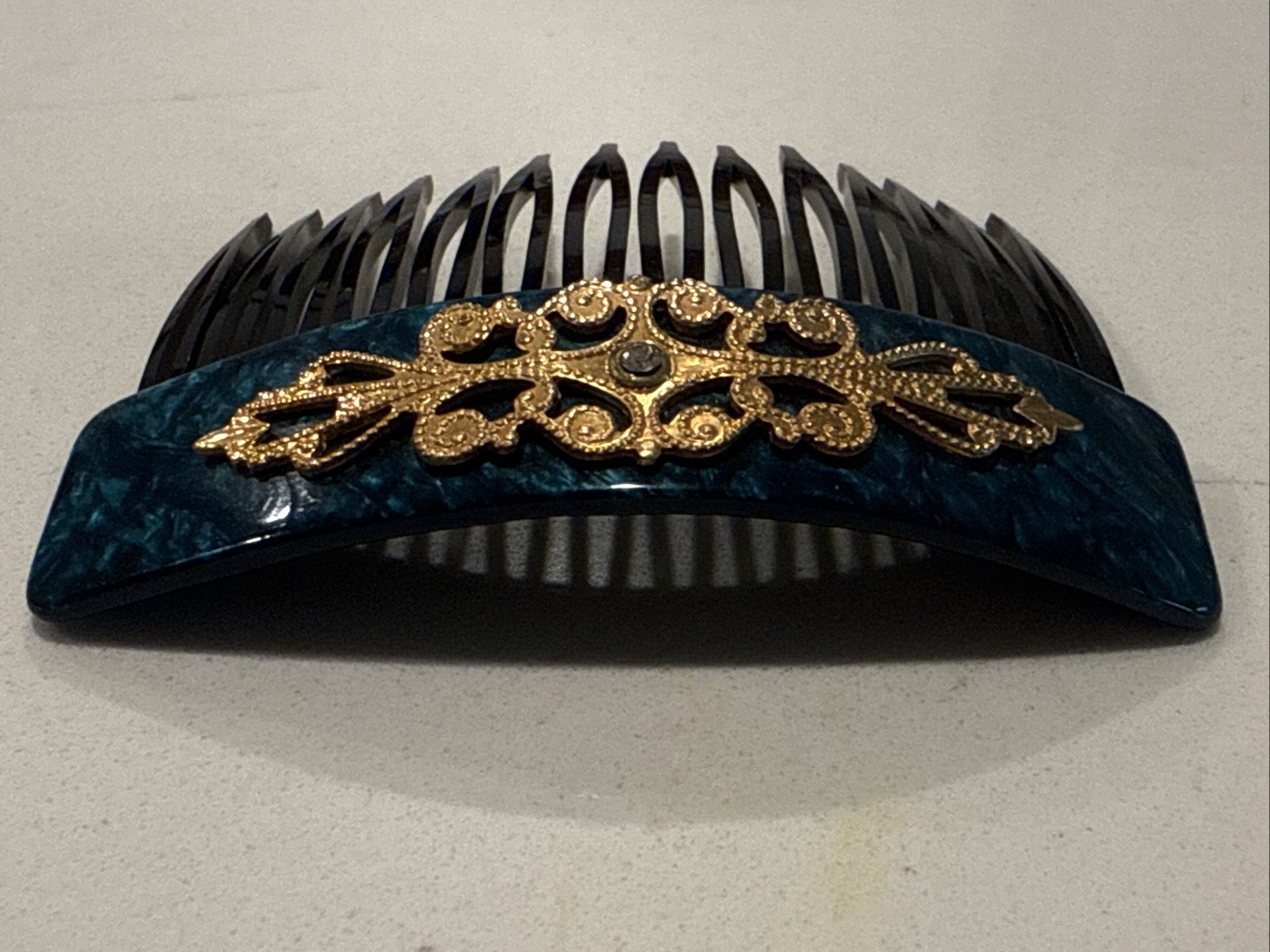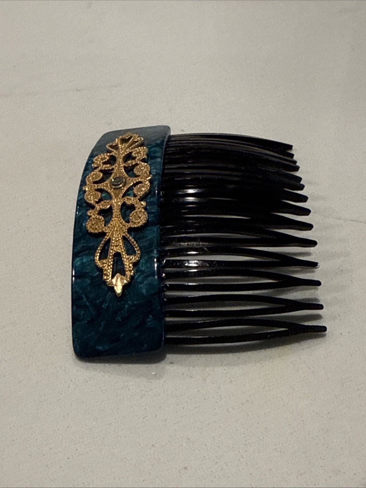 как выглядит French Vintage Hair Comb 1930s 1950s Teal Marbled Acetate W/ Applied Filigree фото