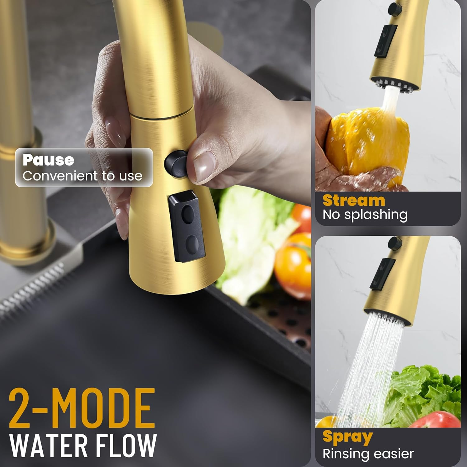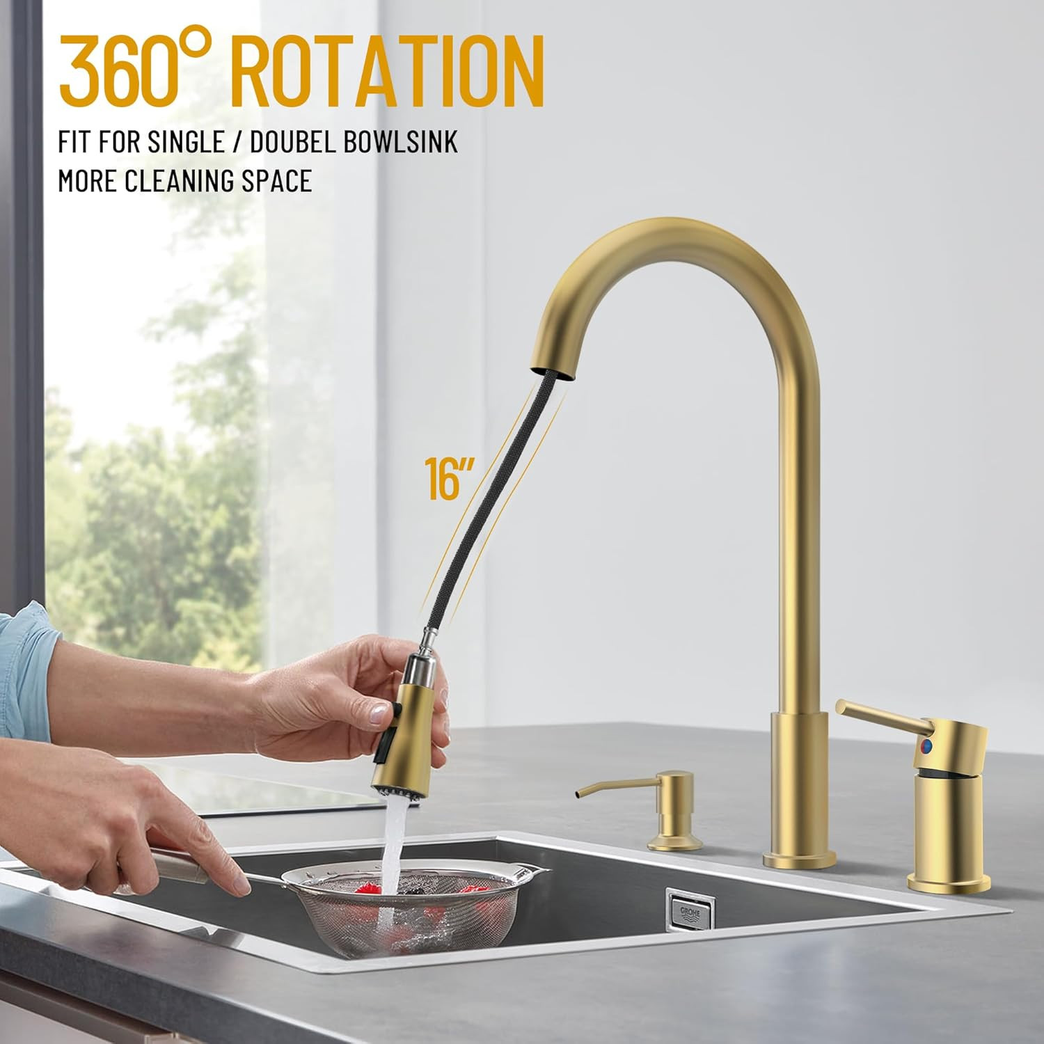 Elegant Gold Brass Kitchen Faucet Set with Pull Down Sprayer Soap Dispenser