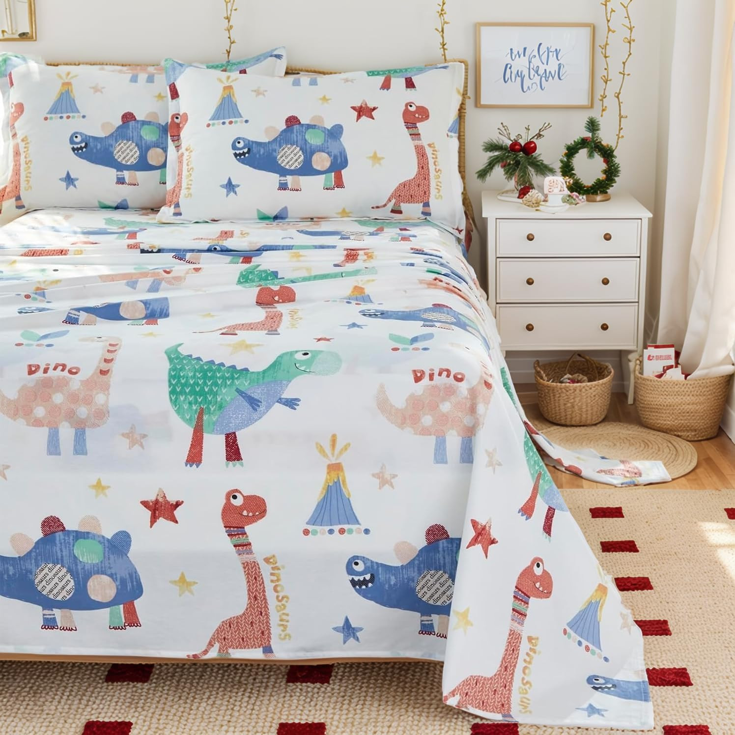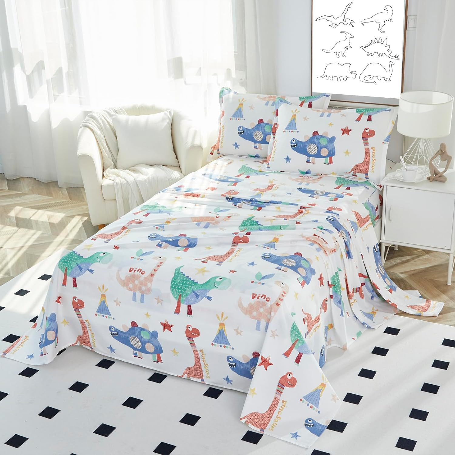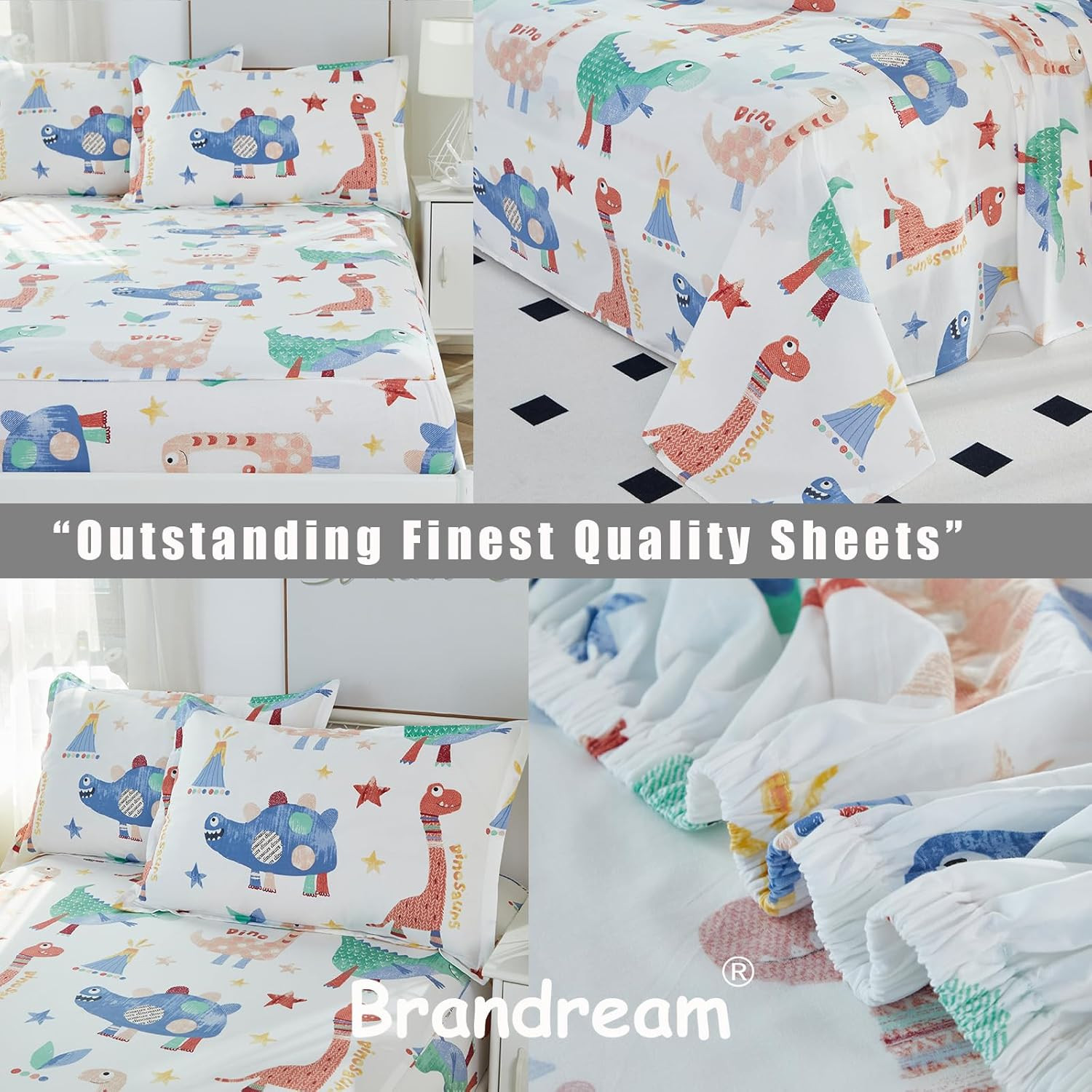 Kid'S Sheet Set Cotton Super Soft Breathable, Twin, 3-Piece, Multi-Color Dinosau