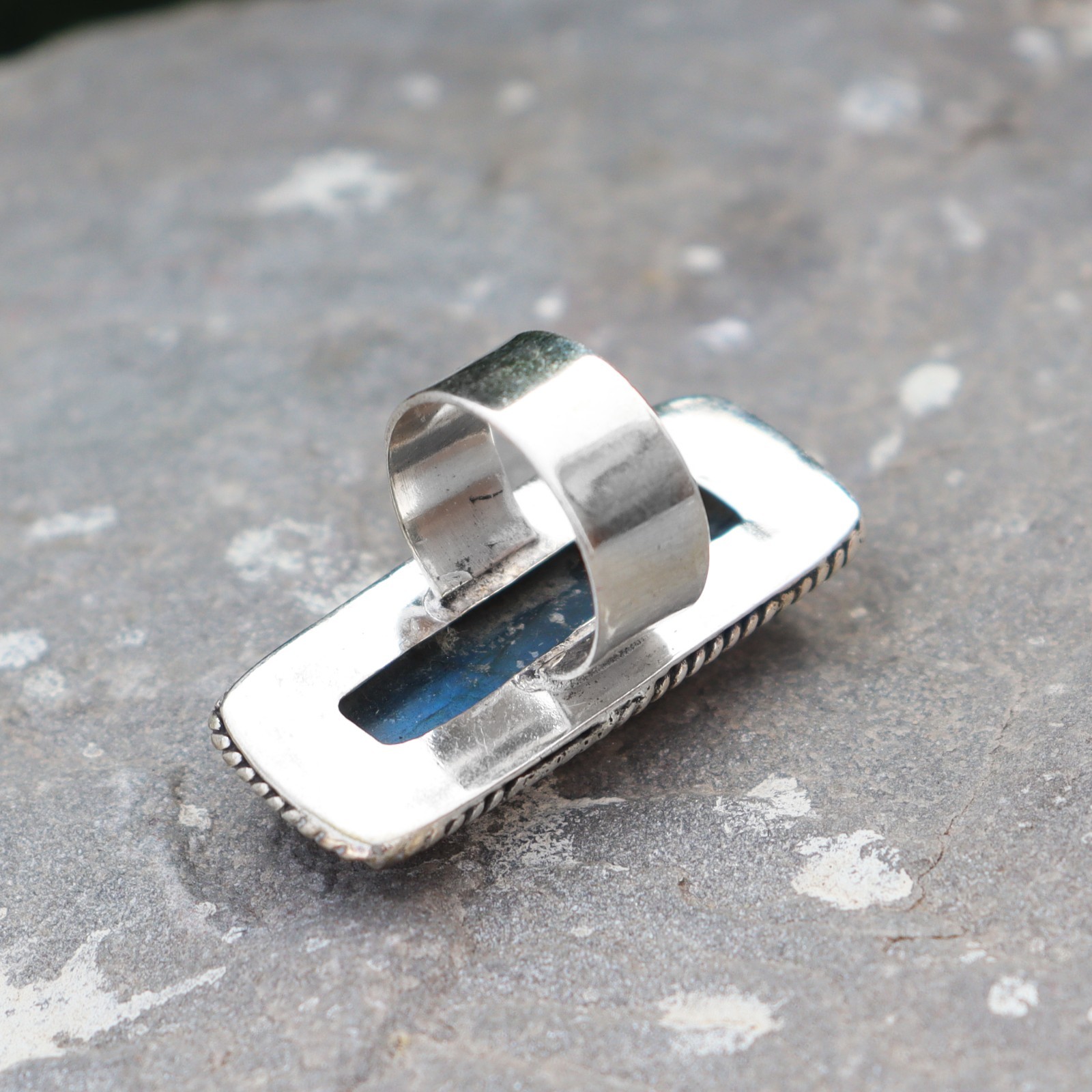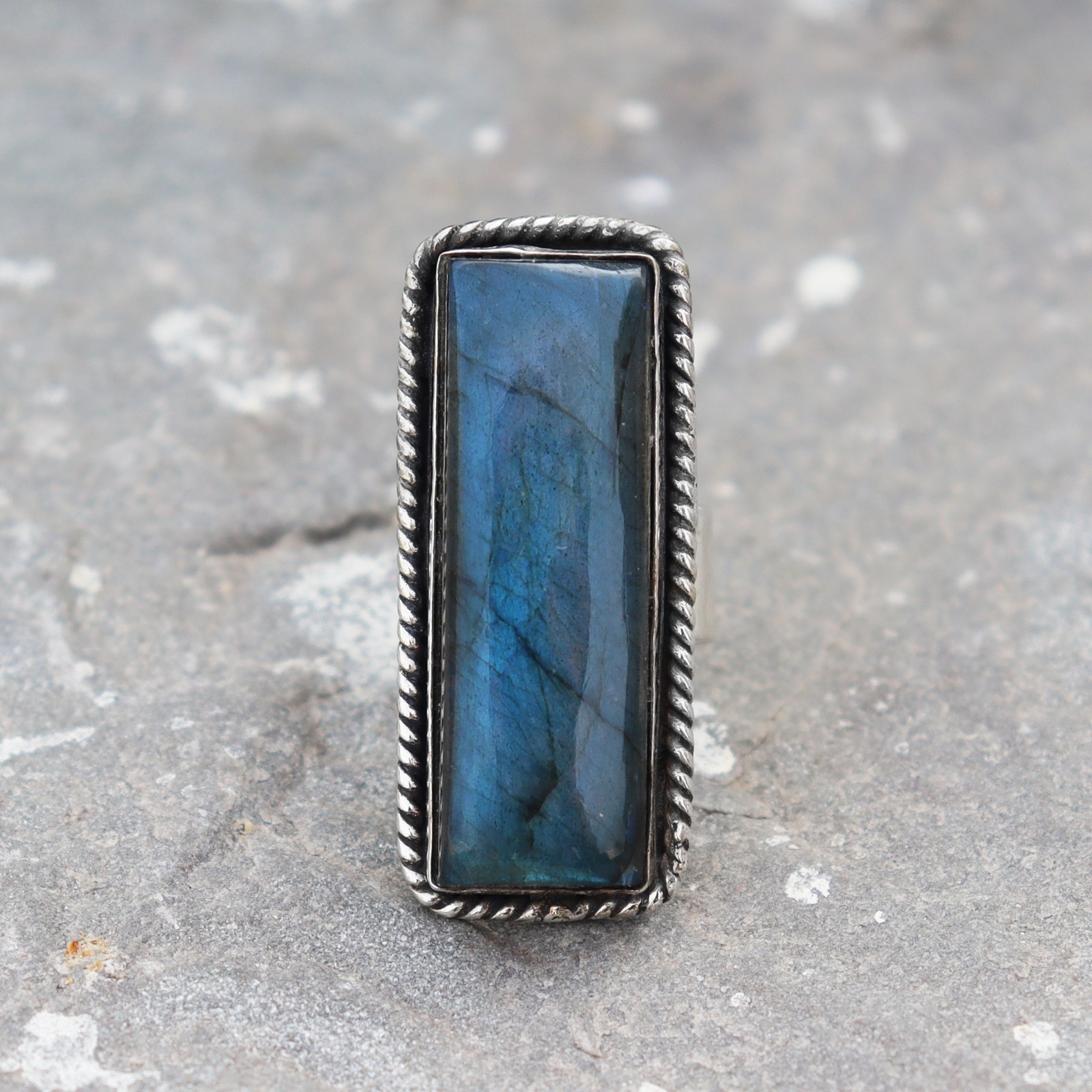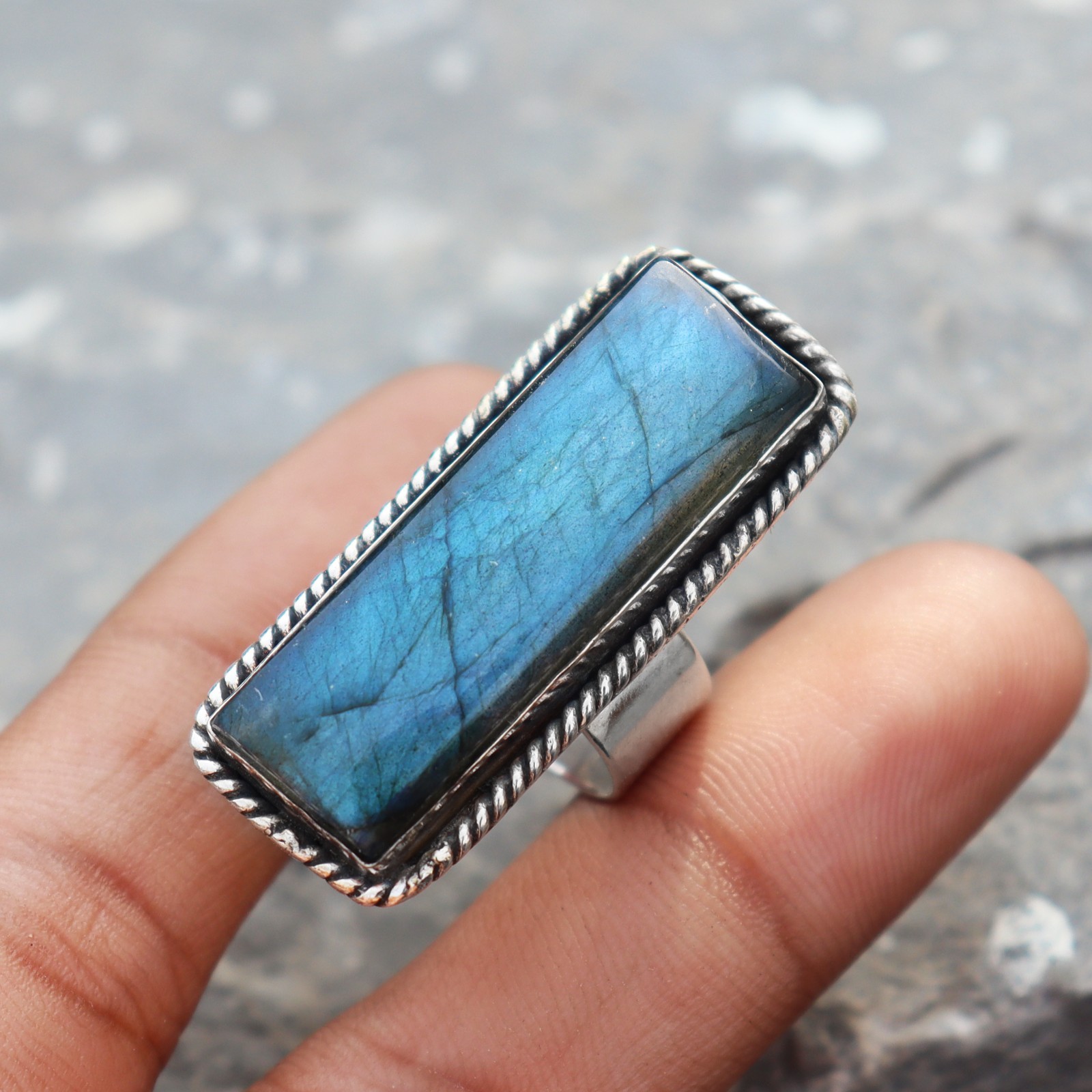 Blue Fire Labradorite Ring, Designer Ring, 925 Silver Ring, Baguette Cut Stone