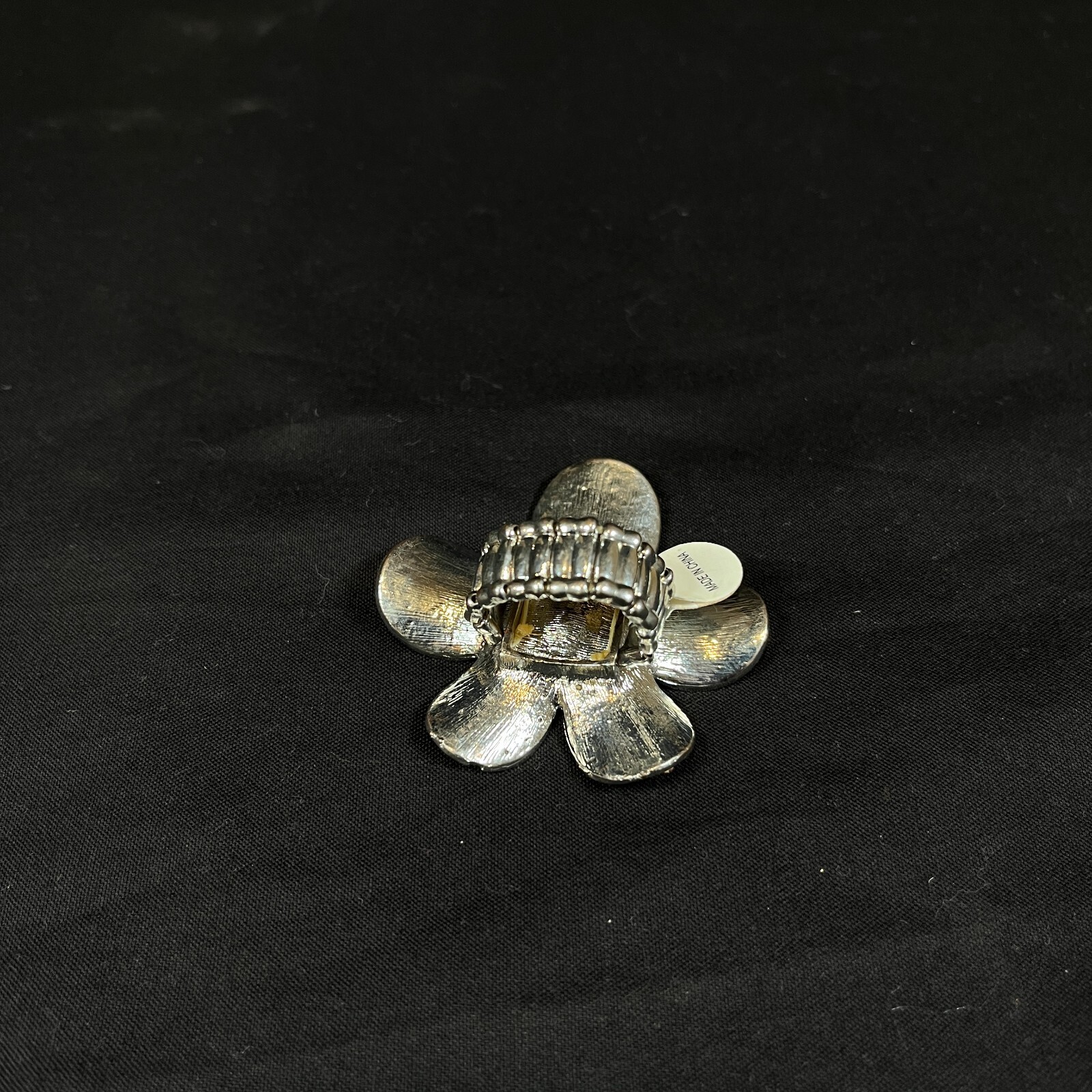 Silver Tone Gray Metallic Red Crystal Flower Large Cocktail Ring Stretch