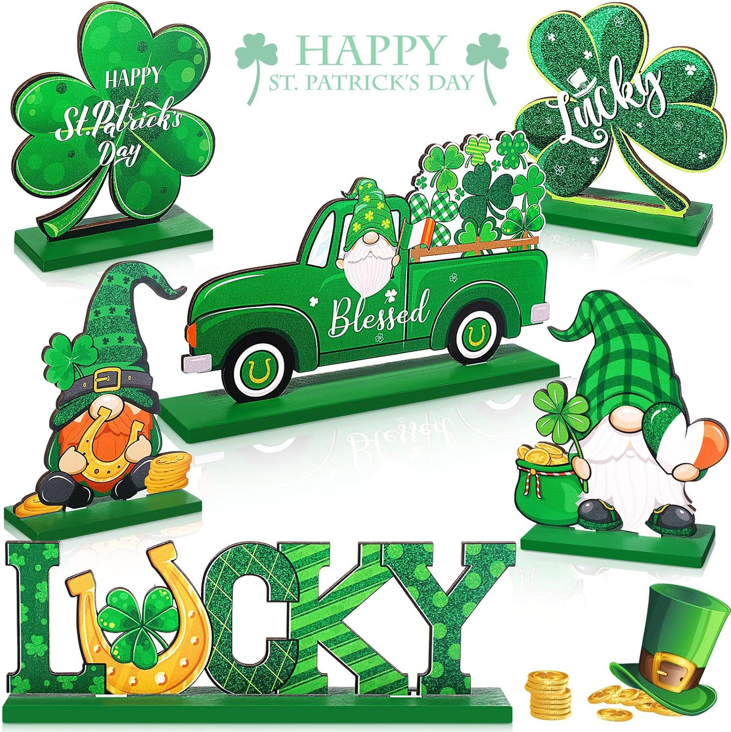 как выглядит St. Patricks Day Table Centerpiece Signs - 6 Piece Gnome Shamrock Decor фото