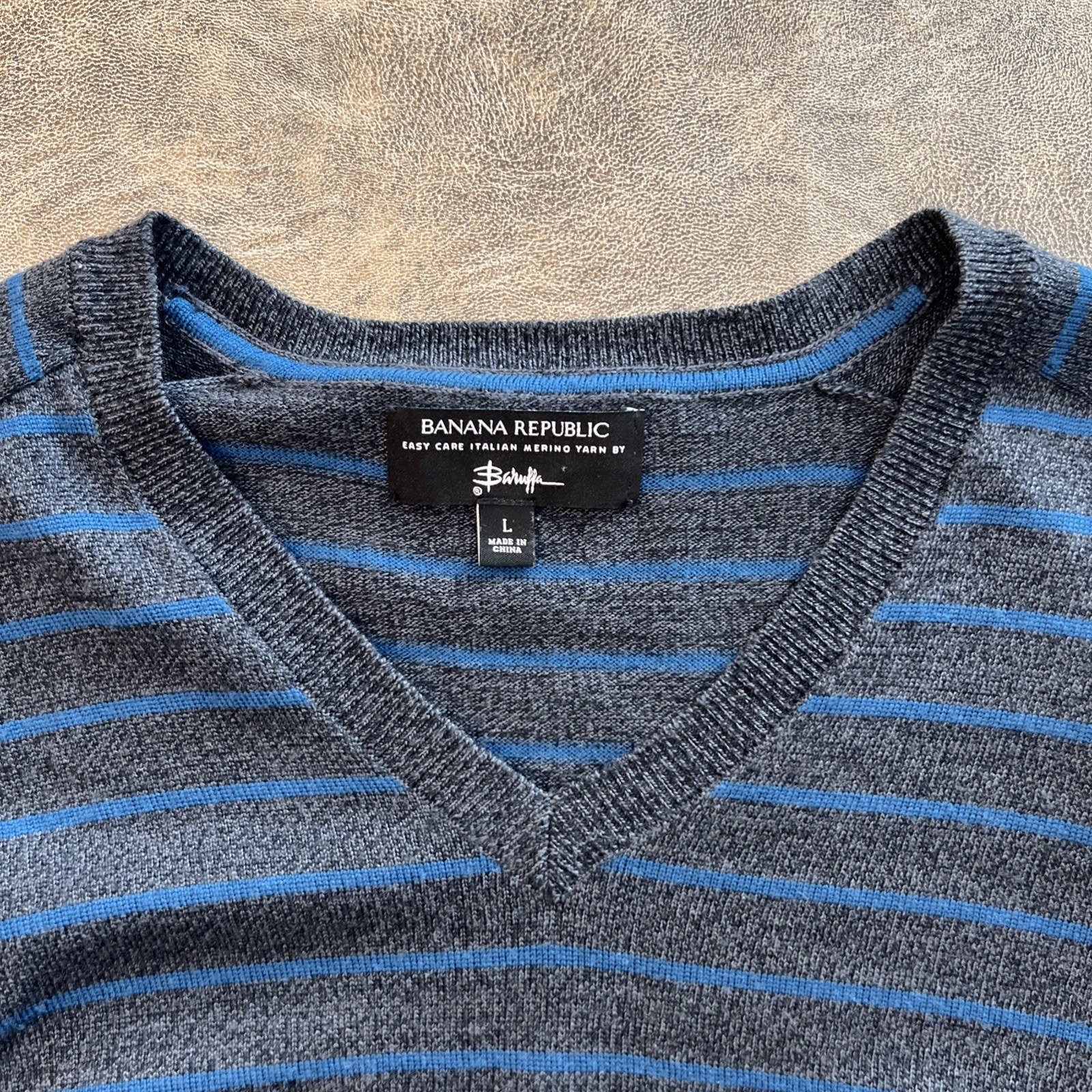 Banana Republic Baruffa Merino Wool Sweater Men's L Gray Blue Stripe V-Neck