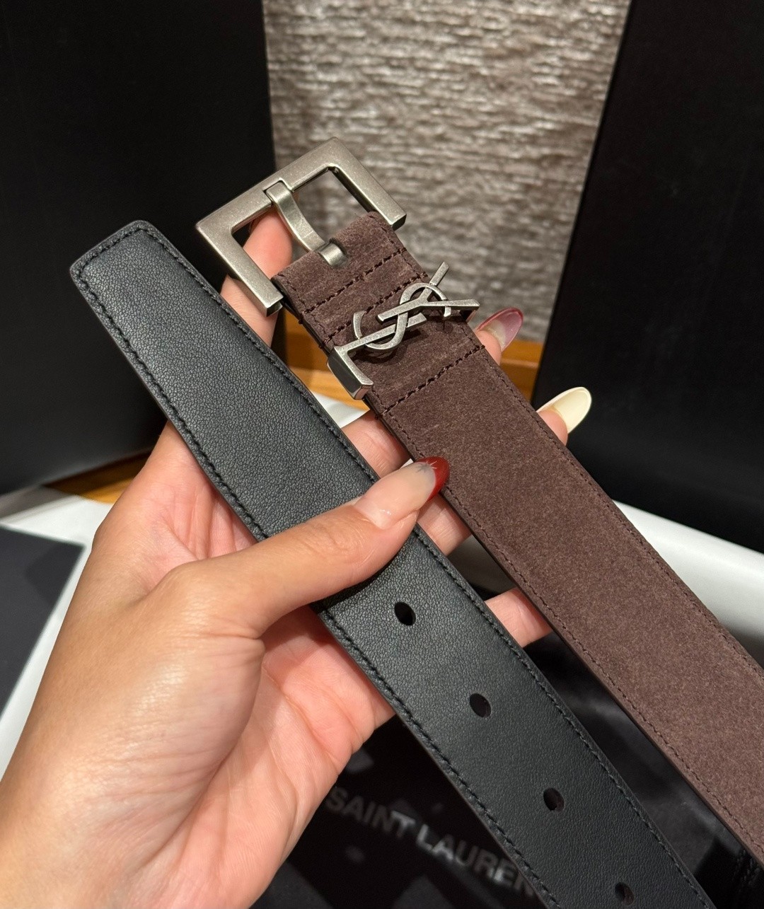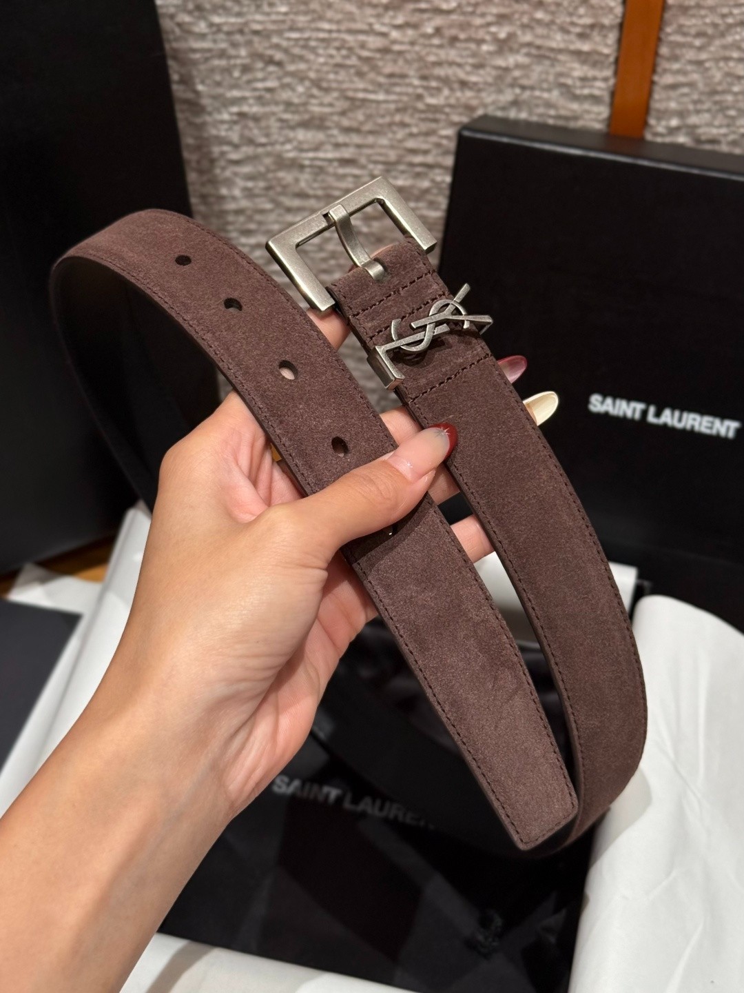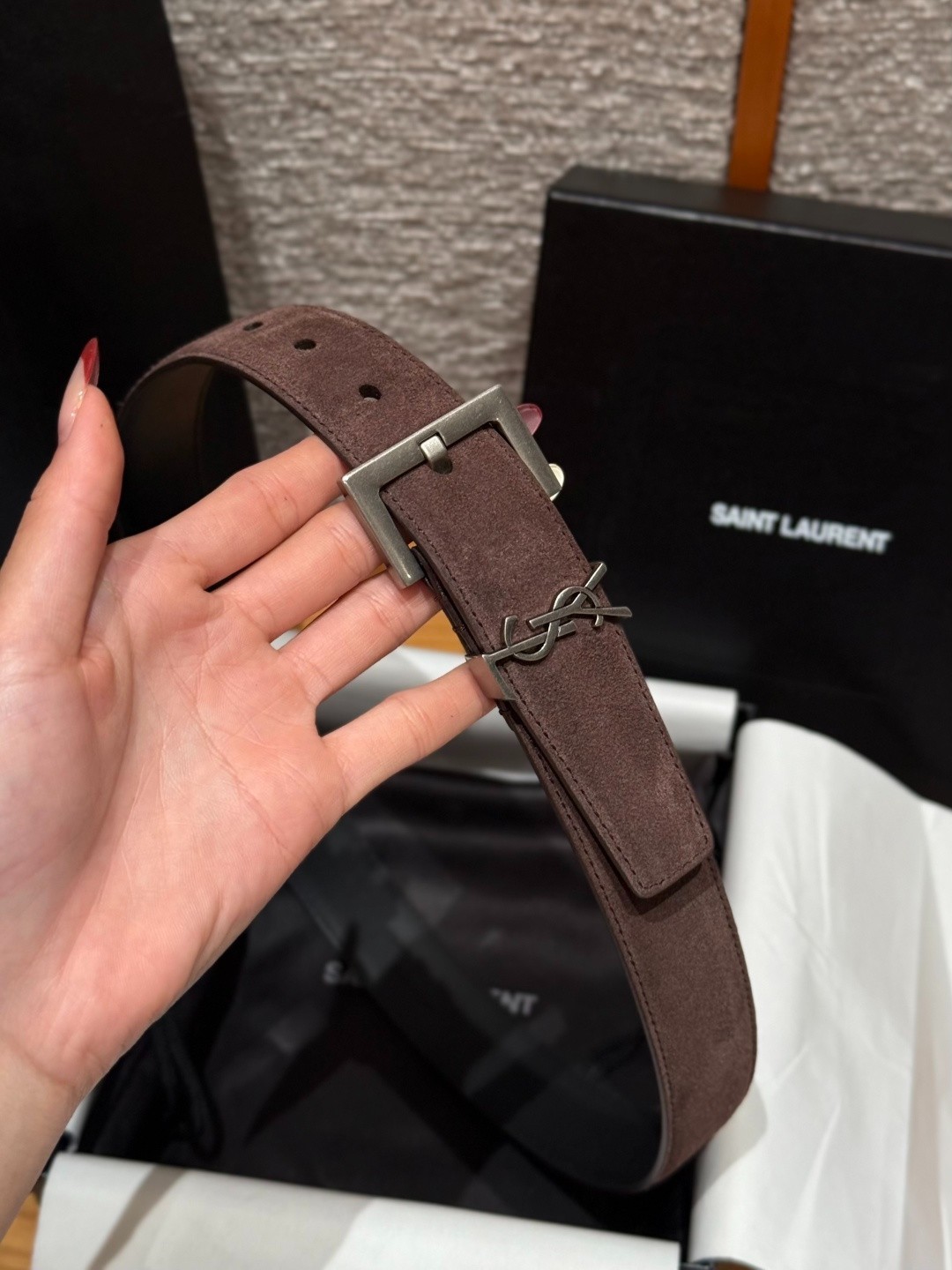 YSL Suede Leather Belt 30mm Brown Silver Buckle