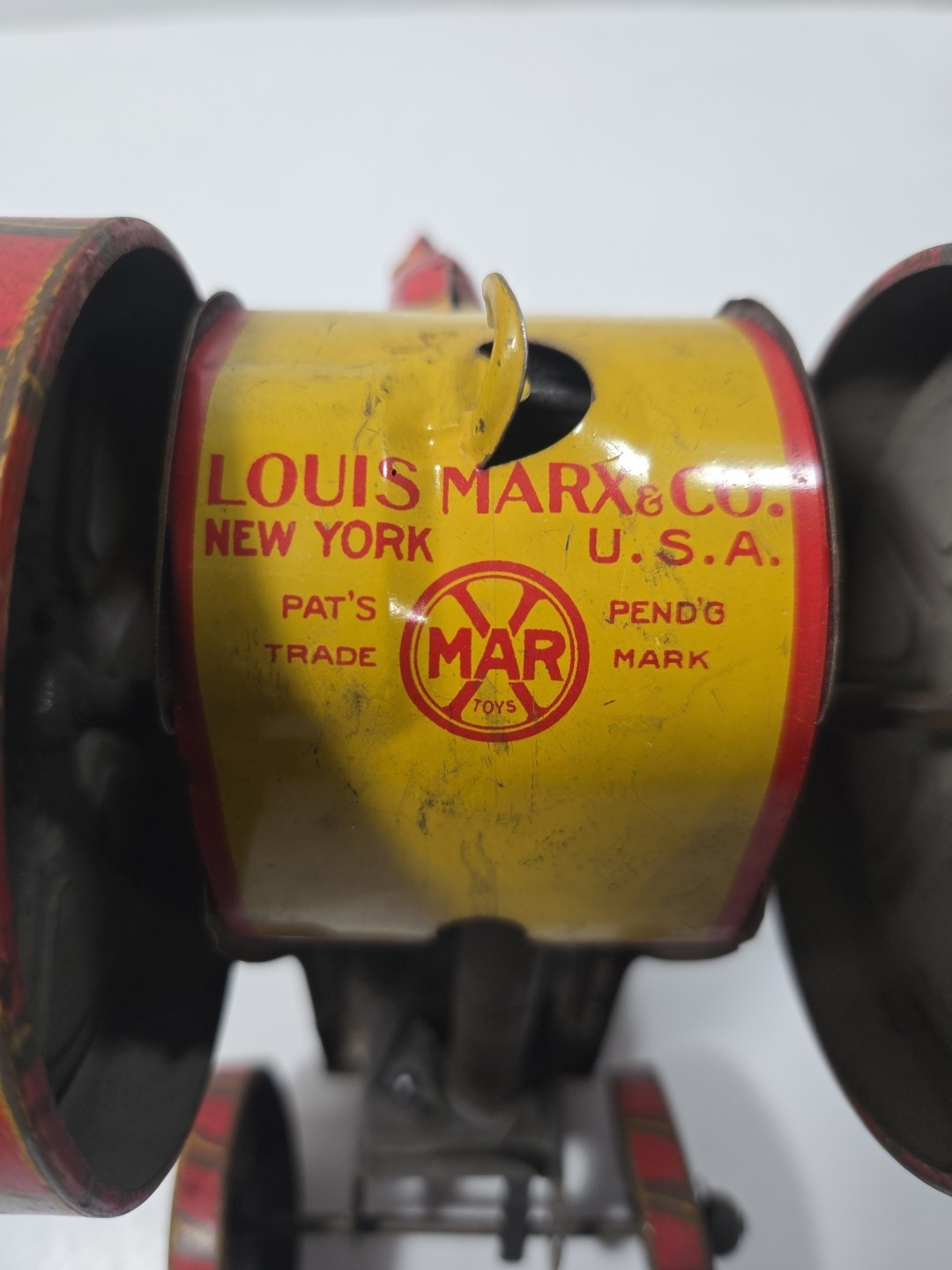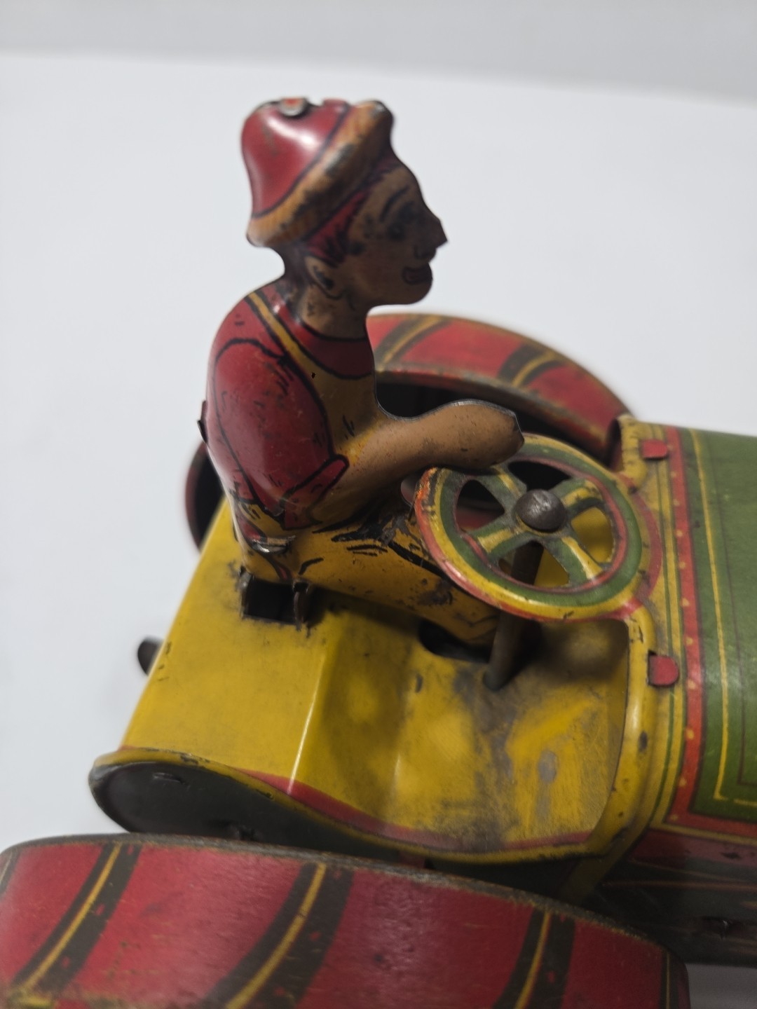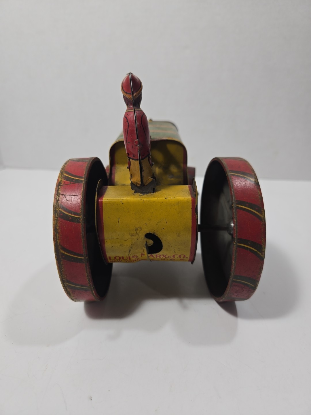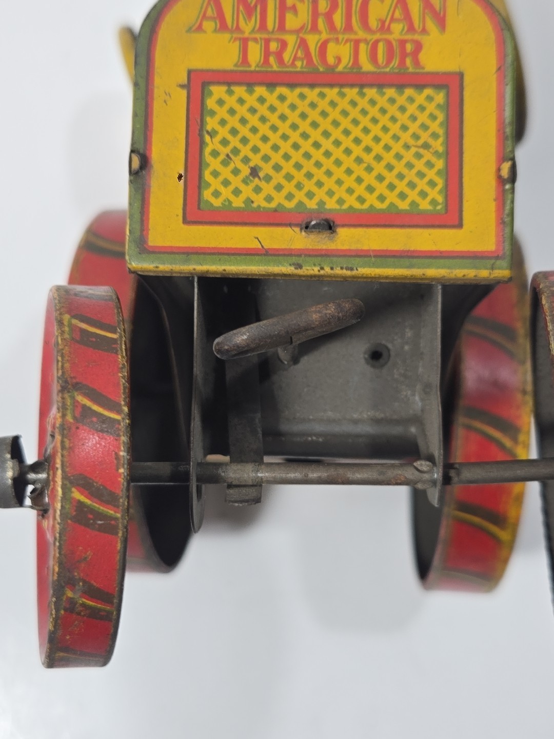 VTG-LOUIS MARX-TIN LITHO-AMERICAN TRACTOR-W/DRIVER 2 ATTACHMENTS-NEEDS REPAIR