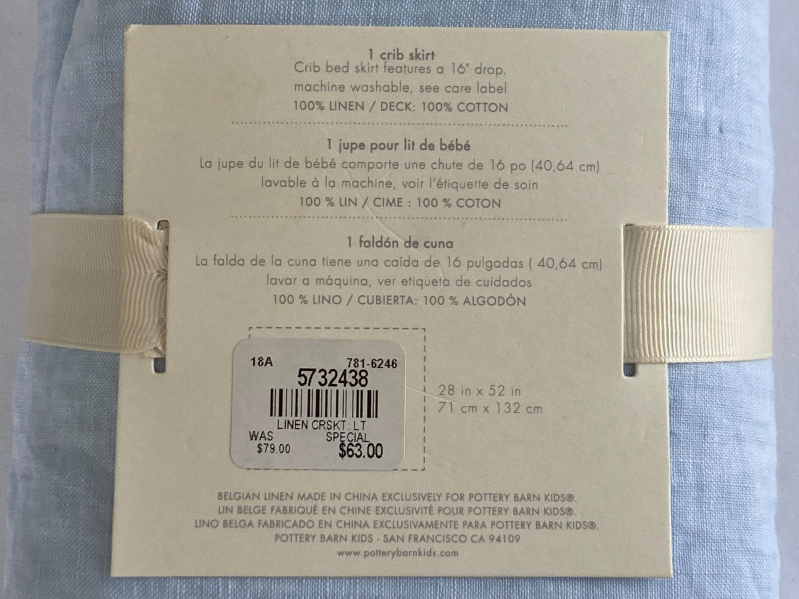 как выглядит NWT Pottery Barn Baby Belgian Flax Linen Light Blue Crib Skirt фото
