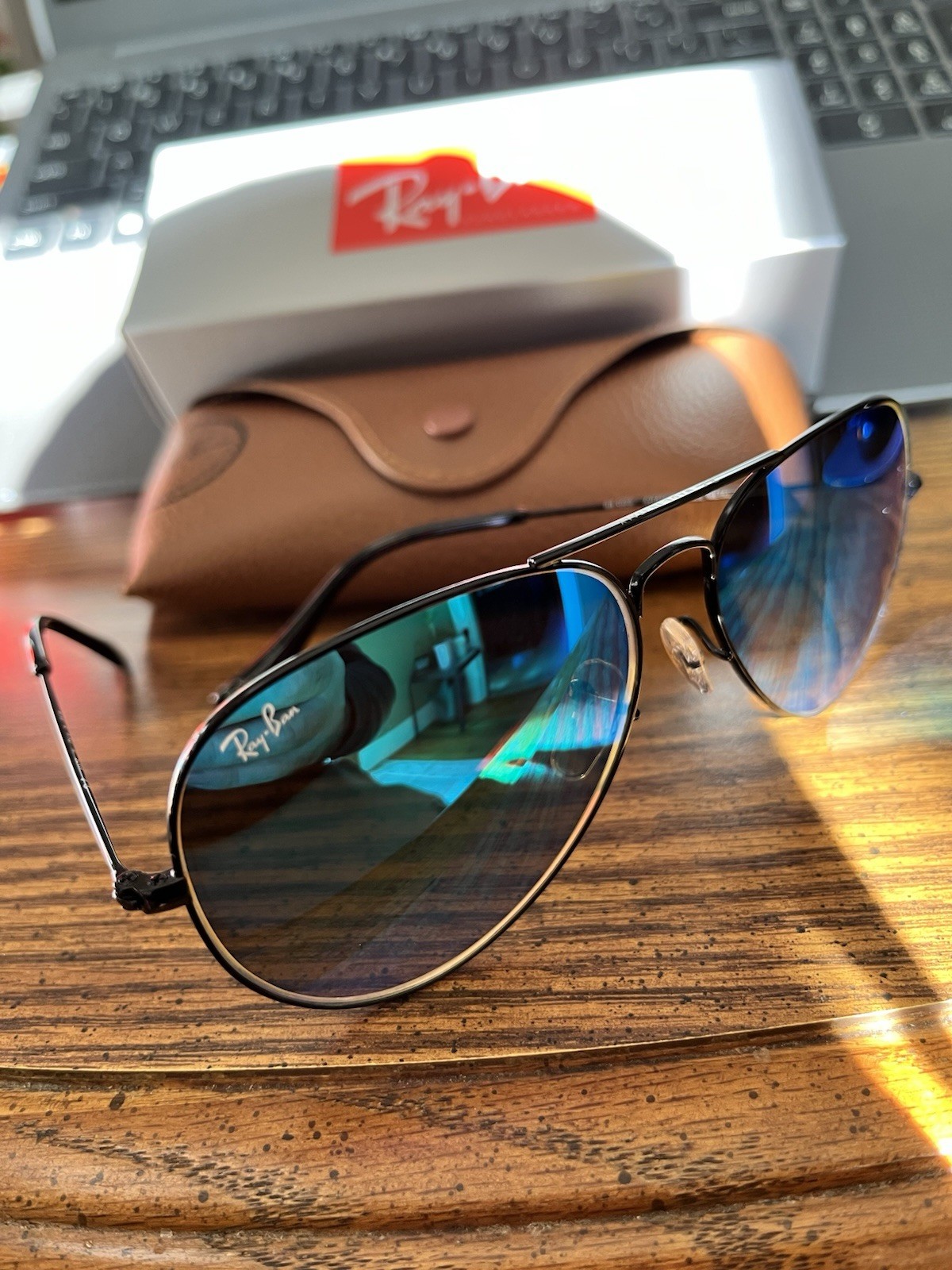 как выглядит RAY-BAN AVIATORS 58mm. BLACK FRAME WITH BLUE FLASH MIRROR LENSES. NEW. фото
