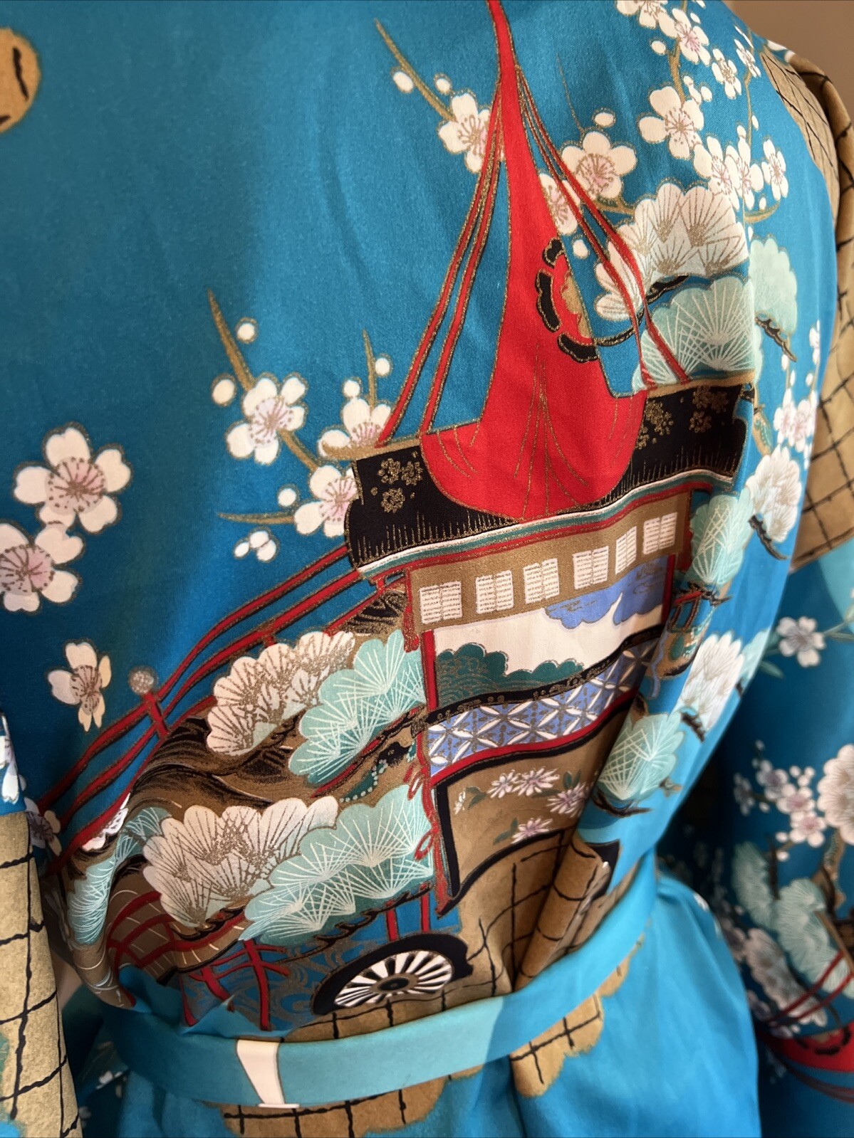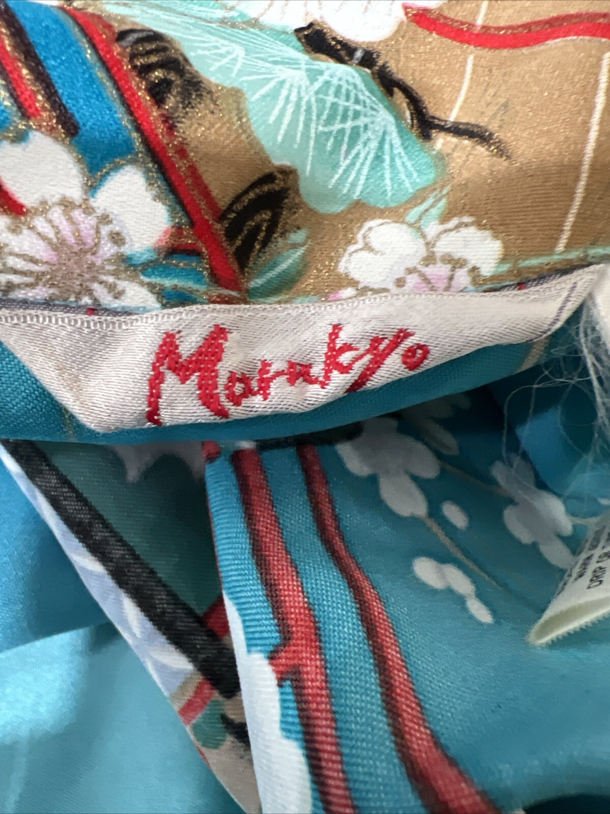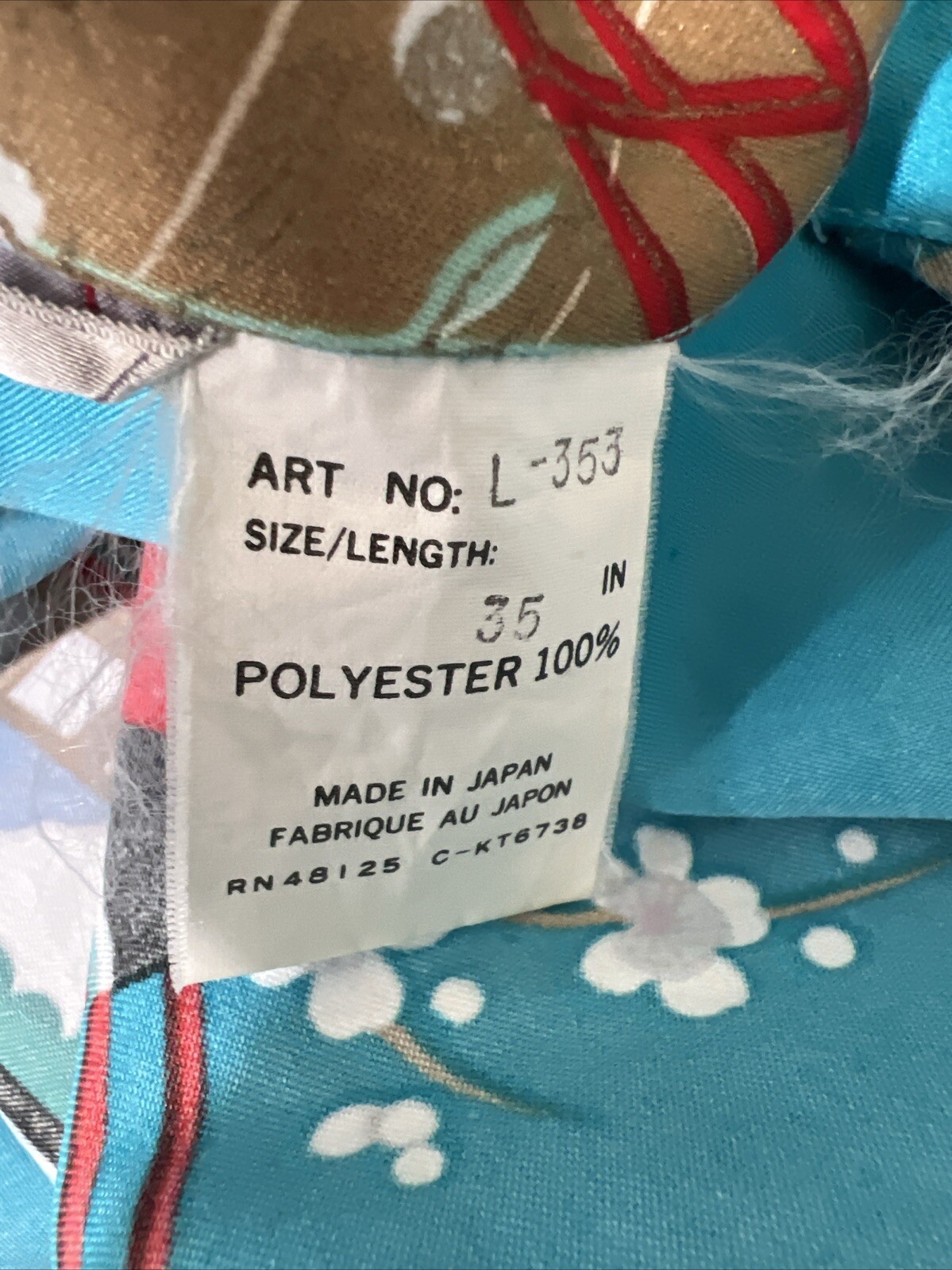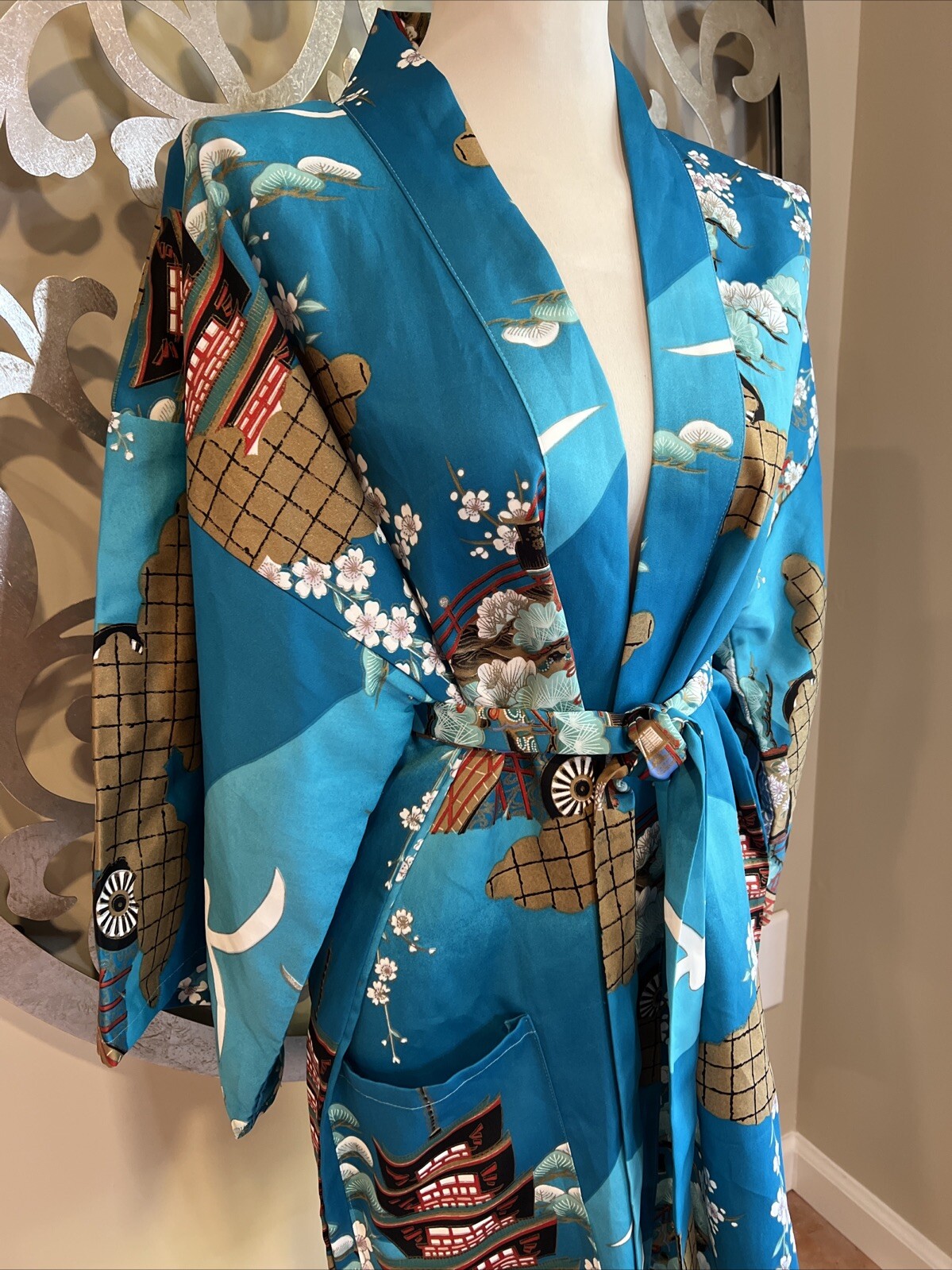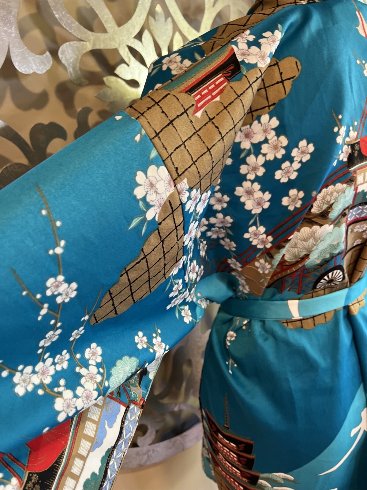 MARUKY Kyoto Tokyo Kimono Robe Size 35 Teal Tower Floral Blue Mid-Length Tie VTG