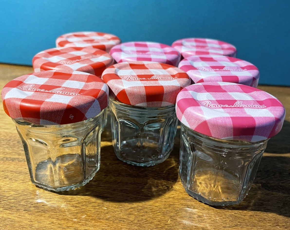 Set of 8 Empty Bonne Maman France 1 Oz Mini Glass Jars - 4 Pink, 4 Red-Free Ship