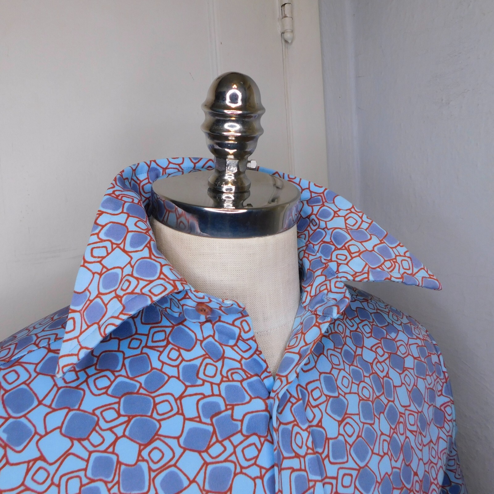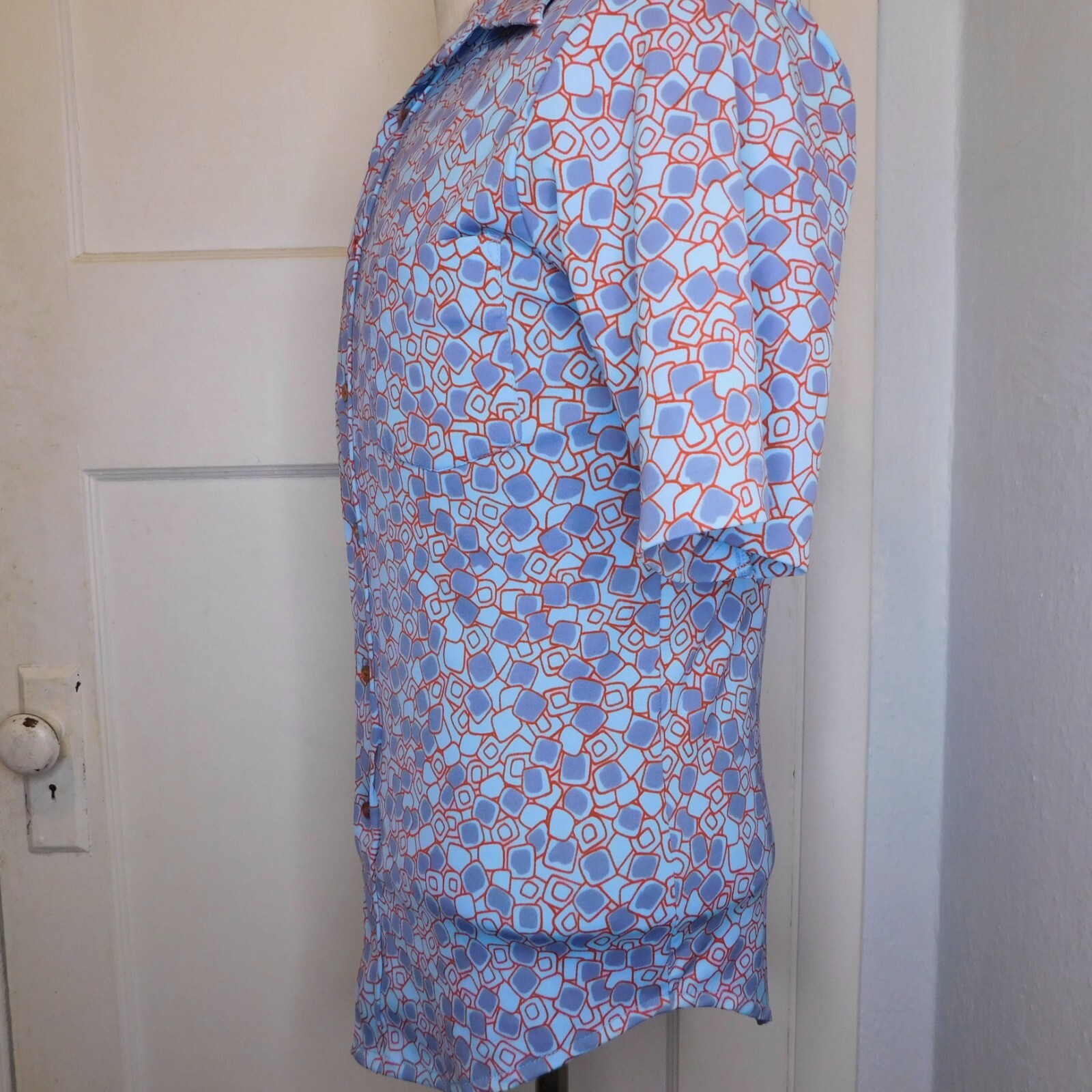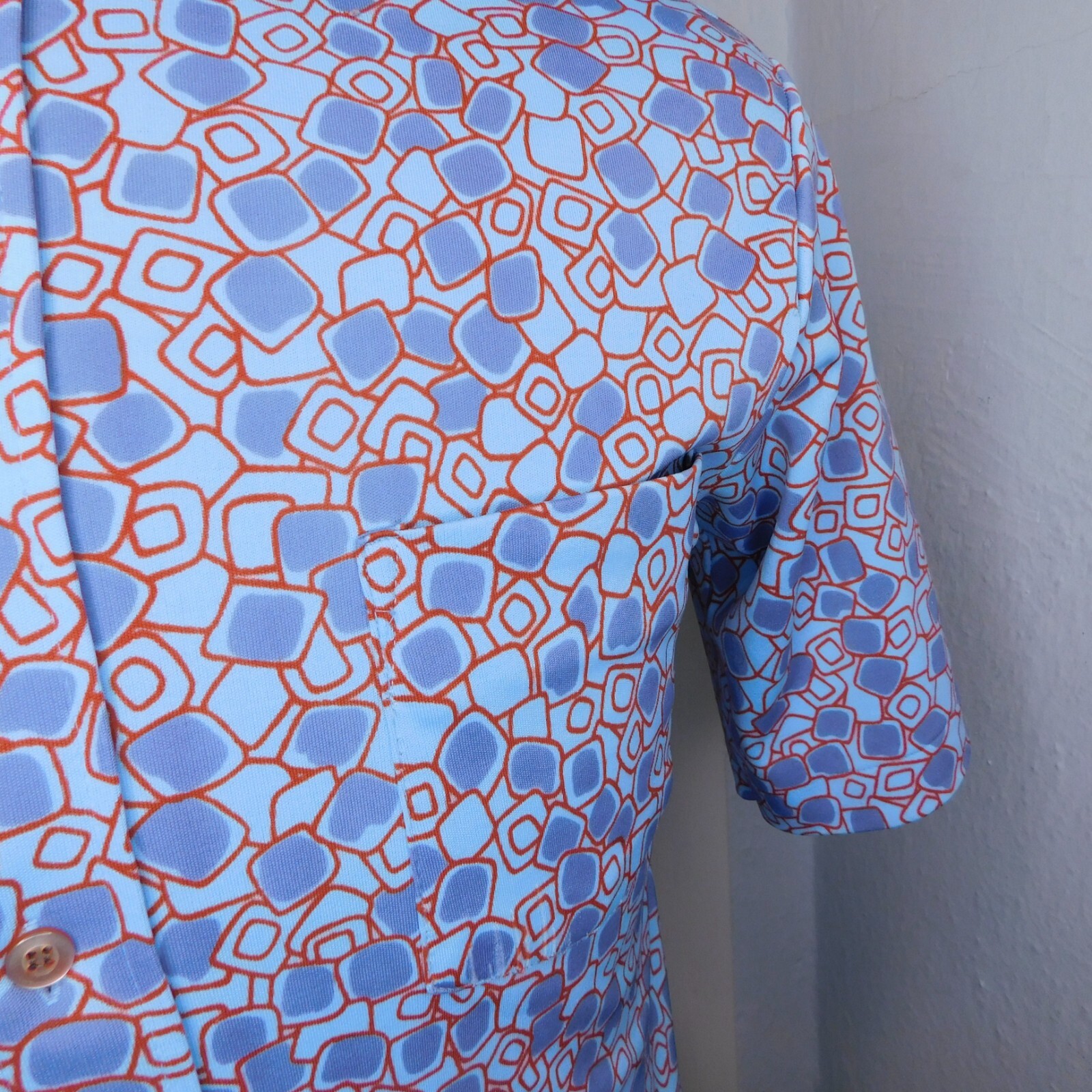 как выглядит Vtg 70s Sears Kings Road Mens Sz M Polyester Blue Novelty Print Disco Shirt S/s фото