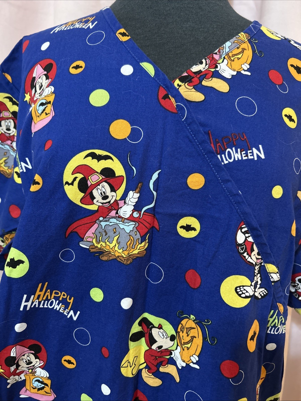 Disney Womans Size L Scrub Top Mickey Mouse Friends Halloween Pockets Blue Mock
