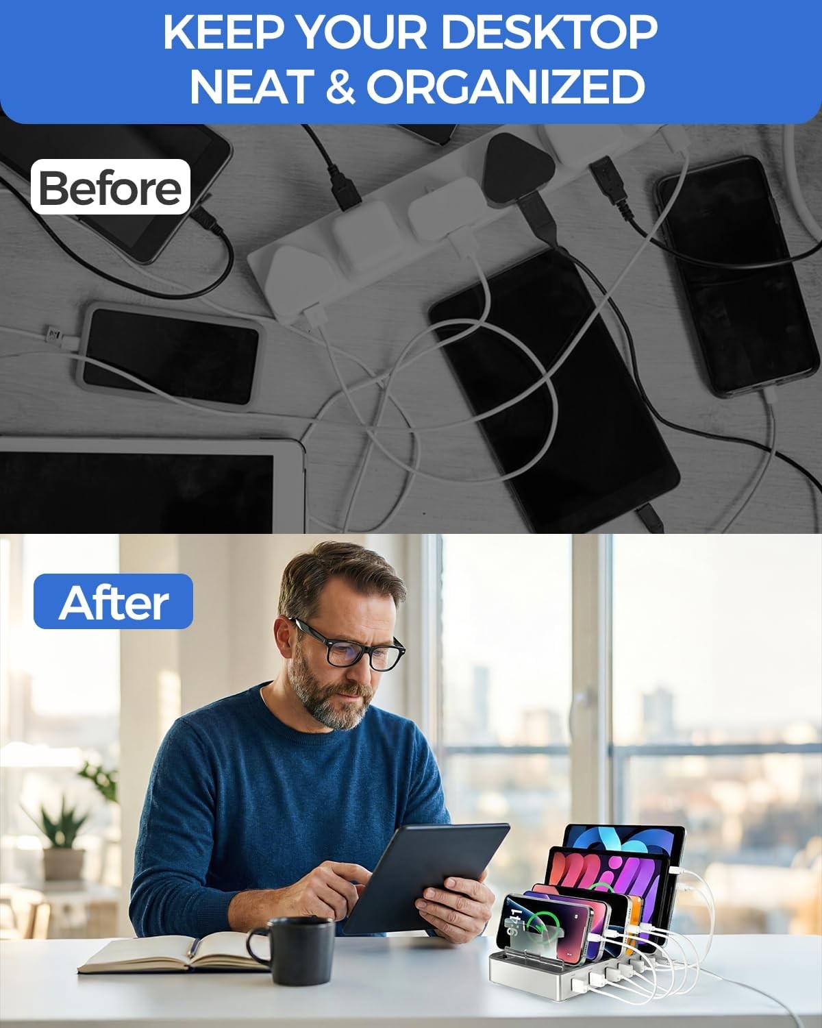 Organized and Clutter-Free: With its space-saving design,this USB charging hub reduces cable