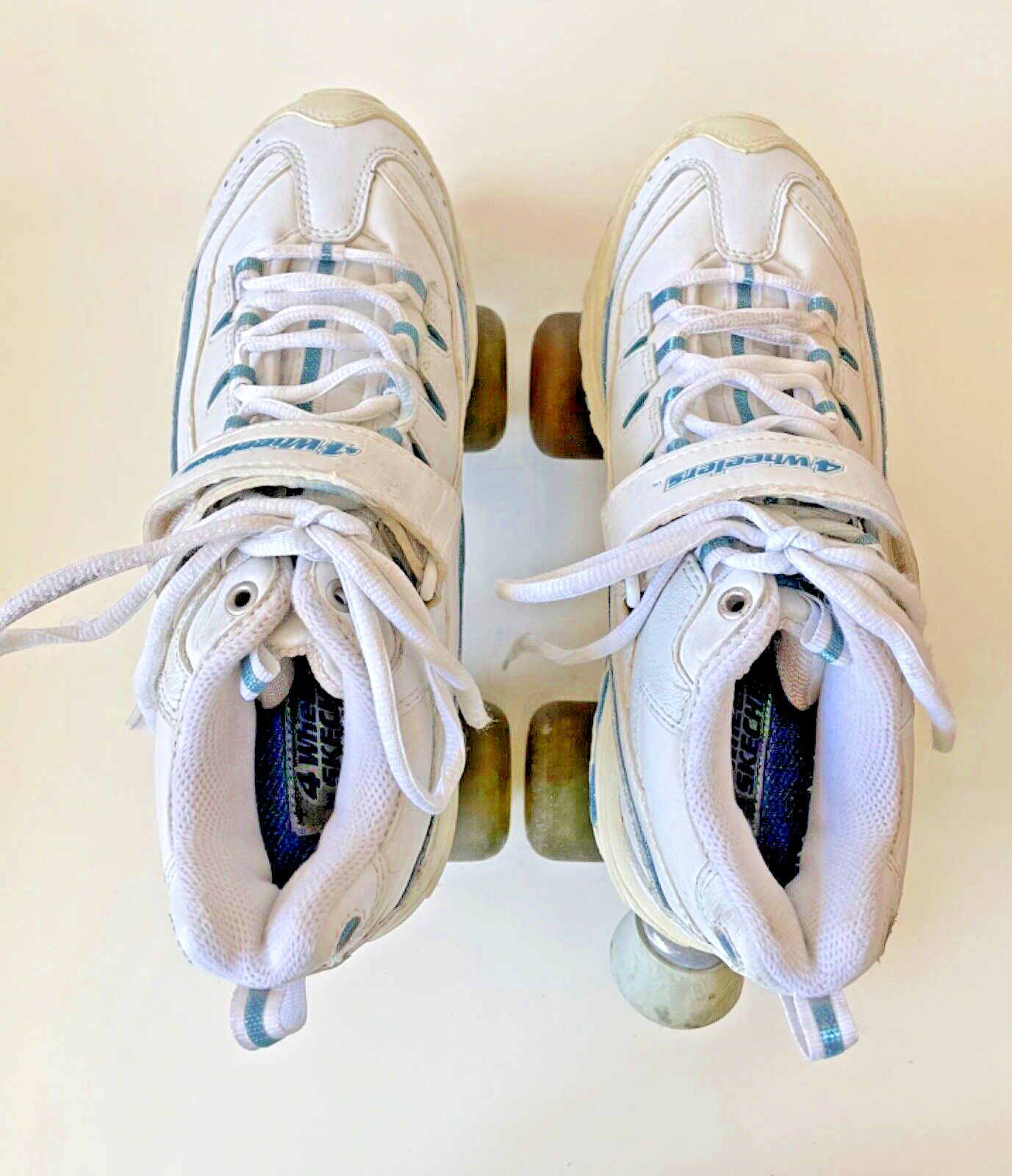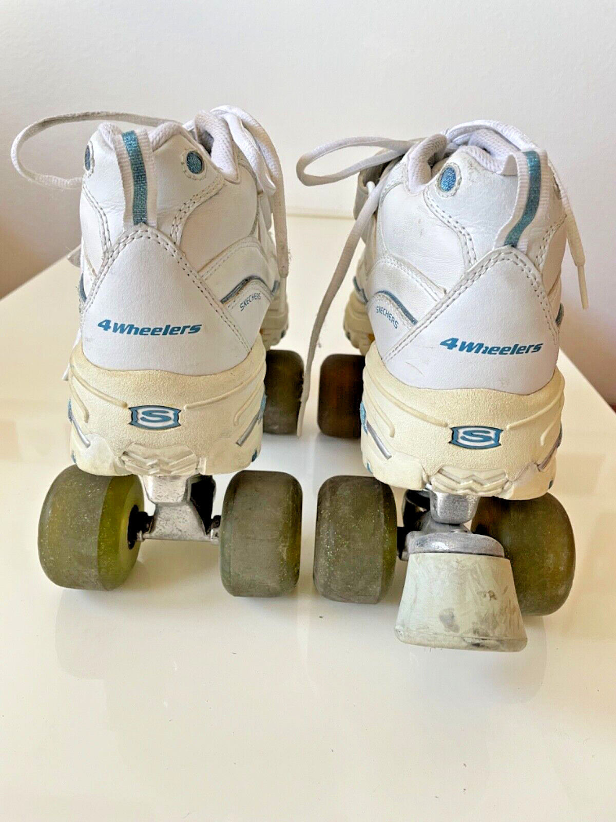как выглядит Skechers Roller Skates 4 Wheelers Womens Size 9 White Leather Blue Trim No Box фото