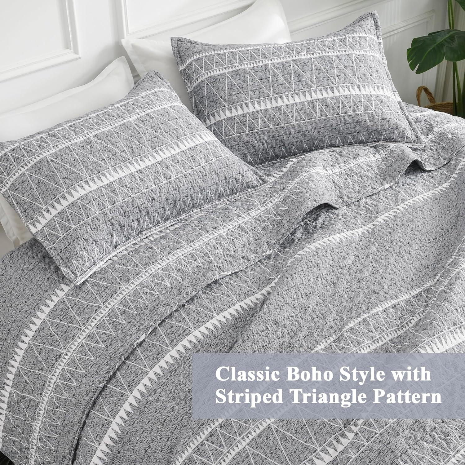 Grey Queen Quilt Bedding Set, 3 Pieces 1 Striped Boho Printed Quilt 90X96 Inch