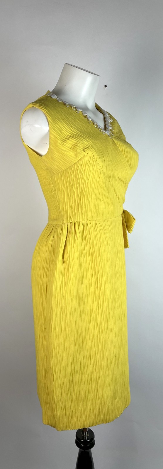 как выглядит Vtg 60s Mod Canary Yellow CARNIVAL sheath dress Bow and Appliques S 32" Bust фото