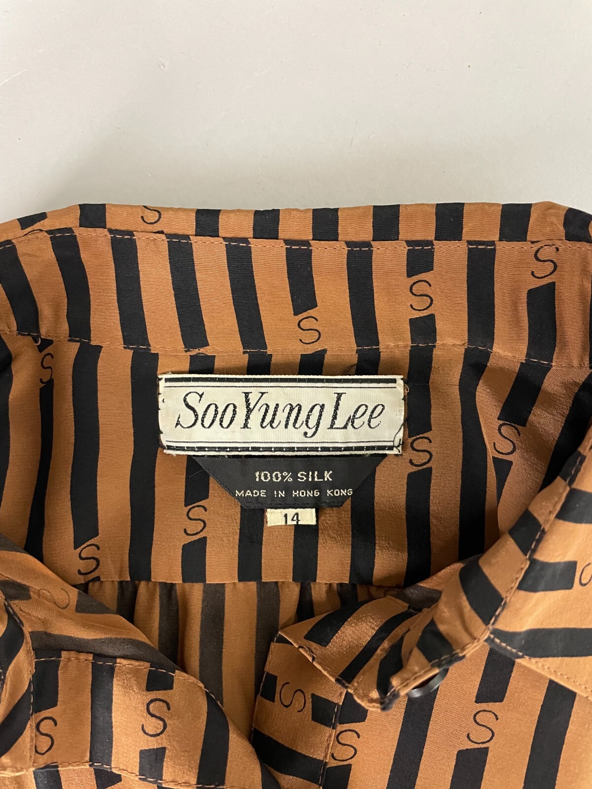 VTG. 80s SOO YUNG LEE Brown Black Stripe Print Long Sleeve Silk Shirt Dress 14