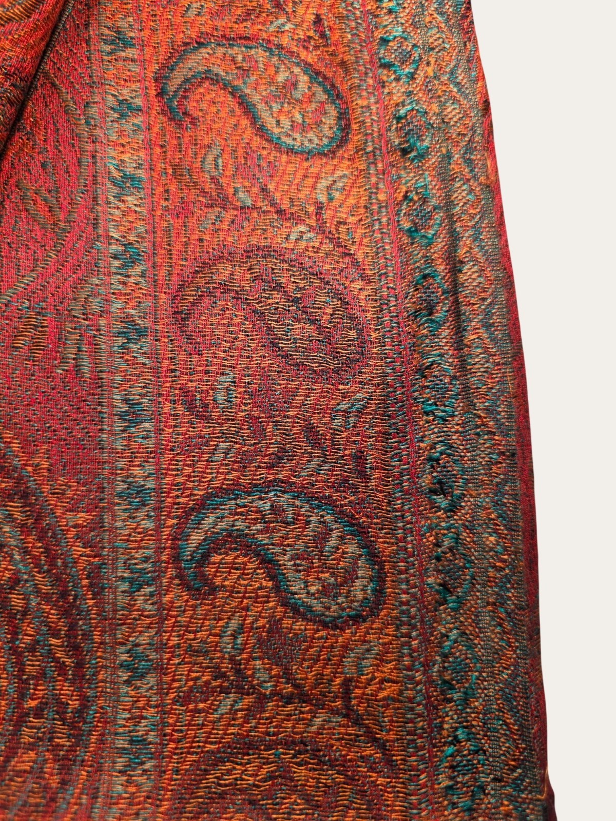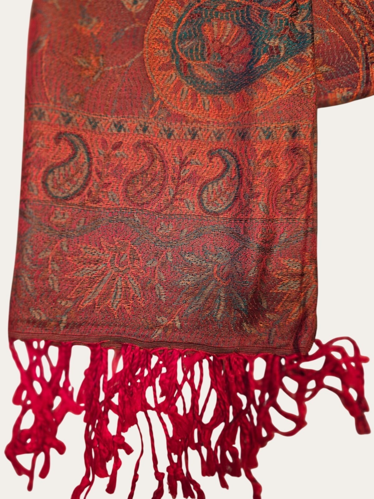 Vintage Paisley Red Orange Woven Scarf With Fringe Lightweight