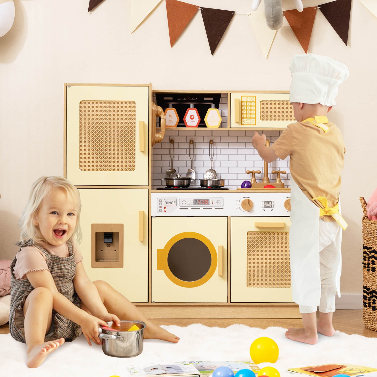 Wooden Kids Kitchen Playset Pretend Play Kitchen w/ Real Sounds Lights Pink