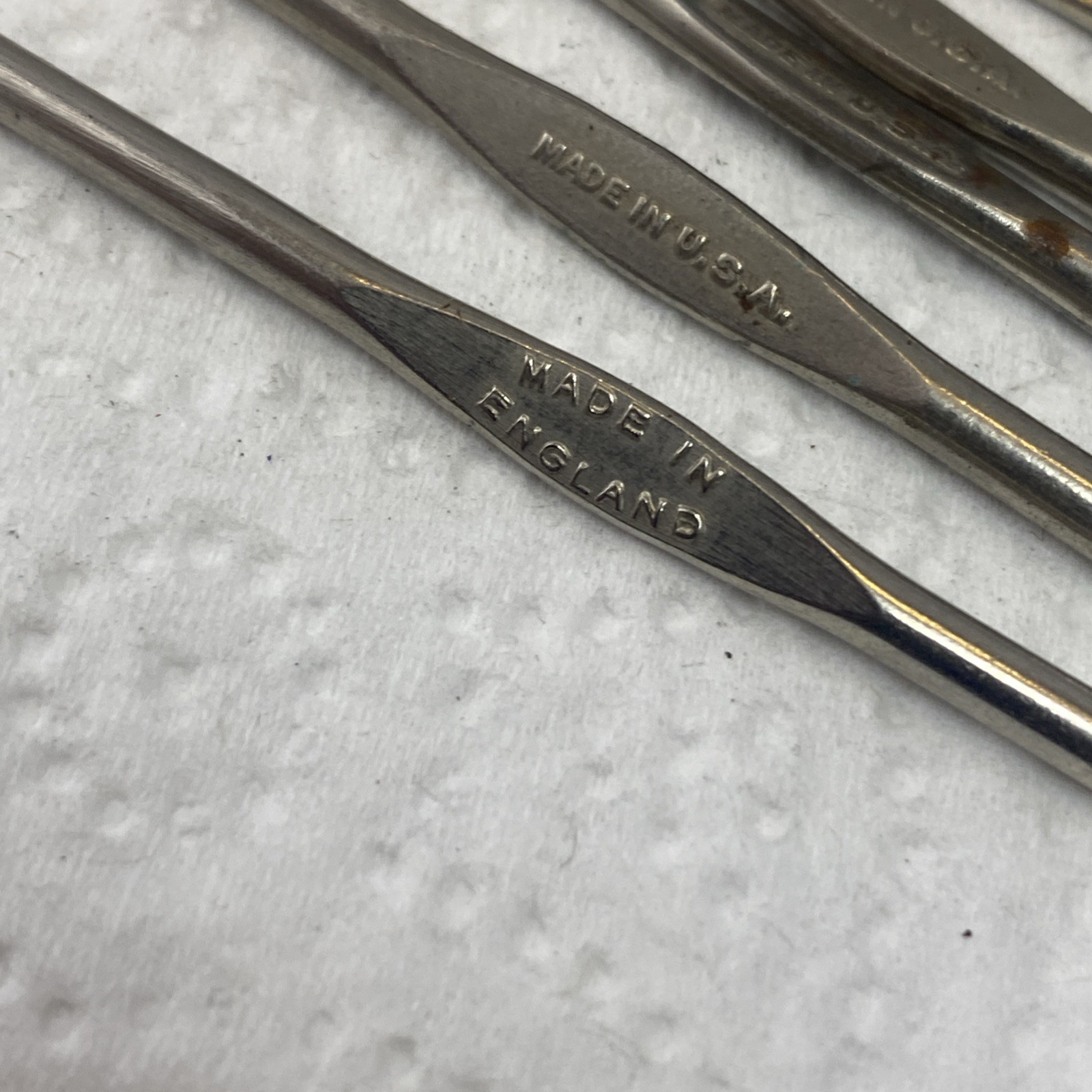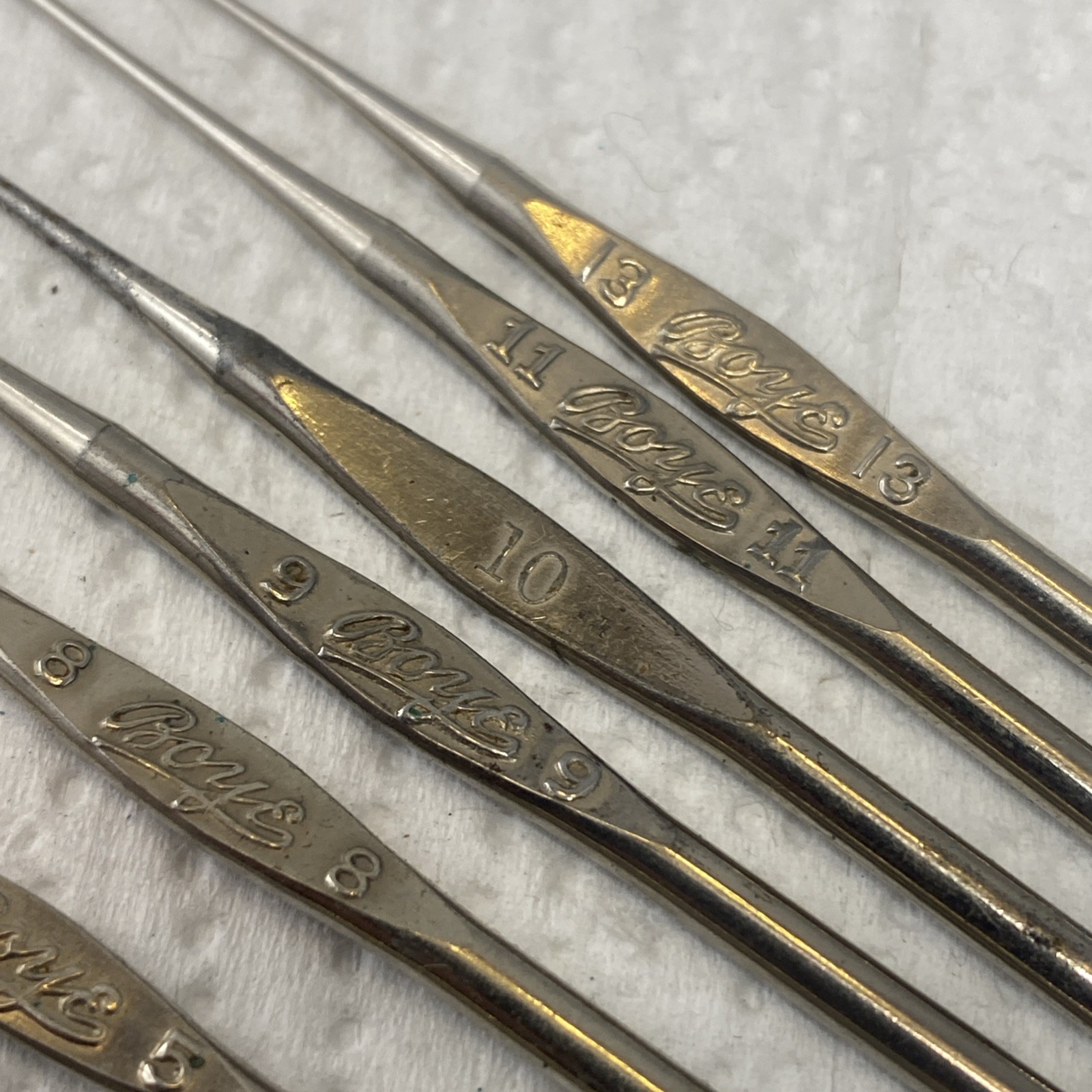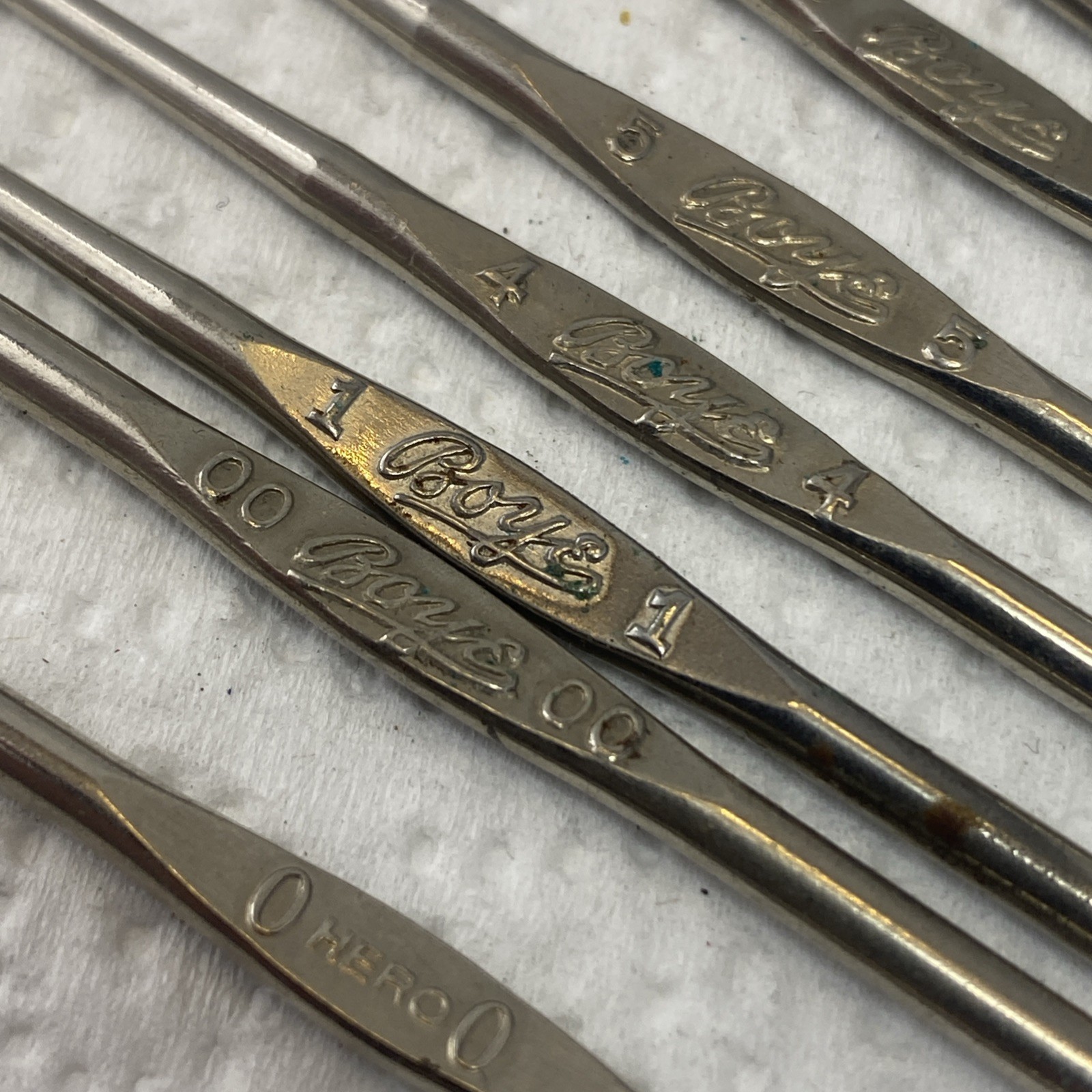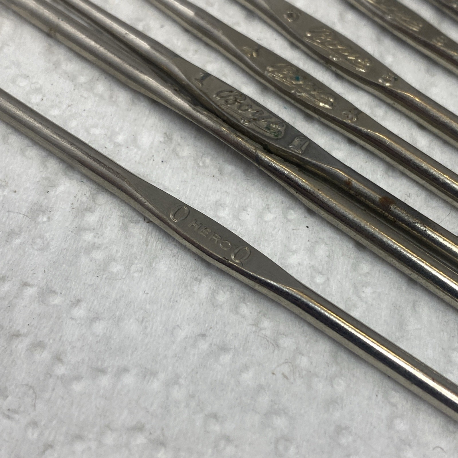 Vtg Metal BOYE Set of 9 Crochet Hooks Plus 1 HERO England Leather Case