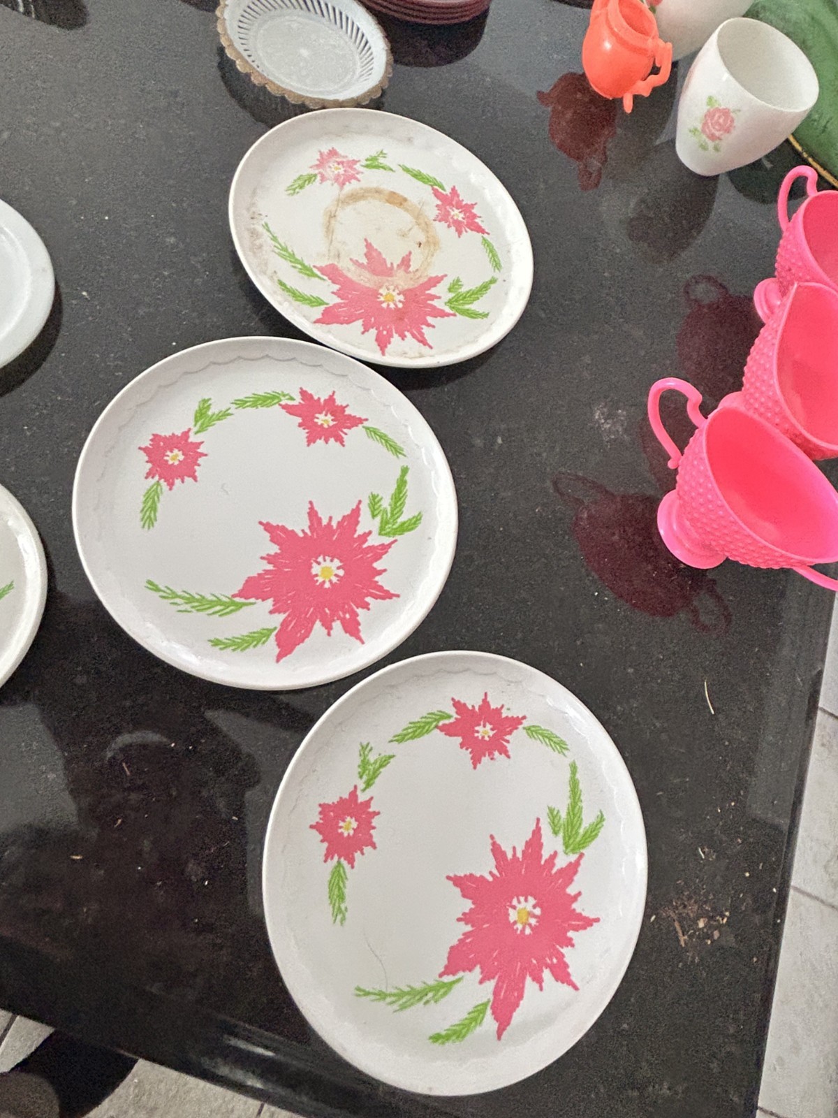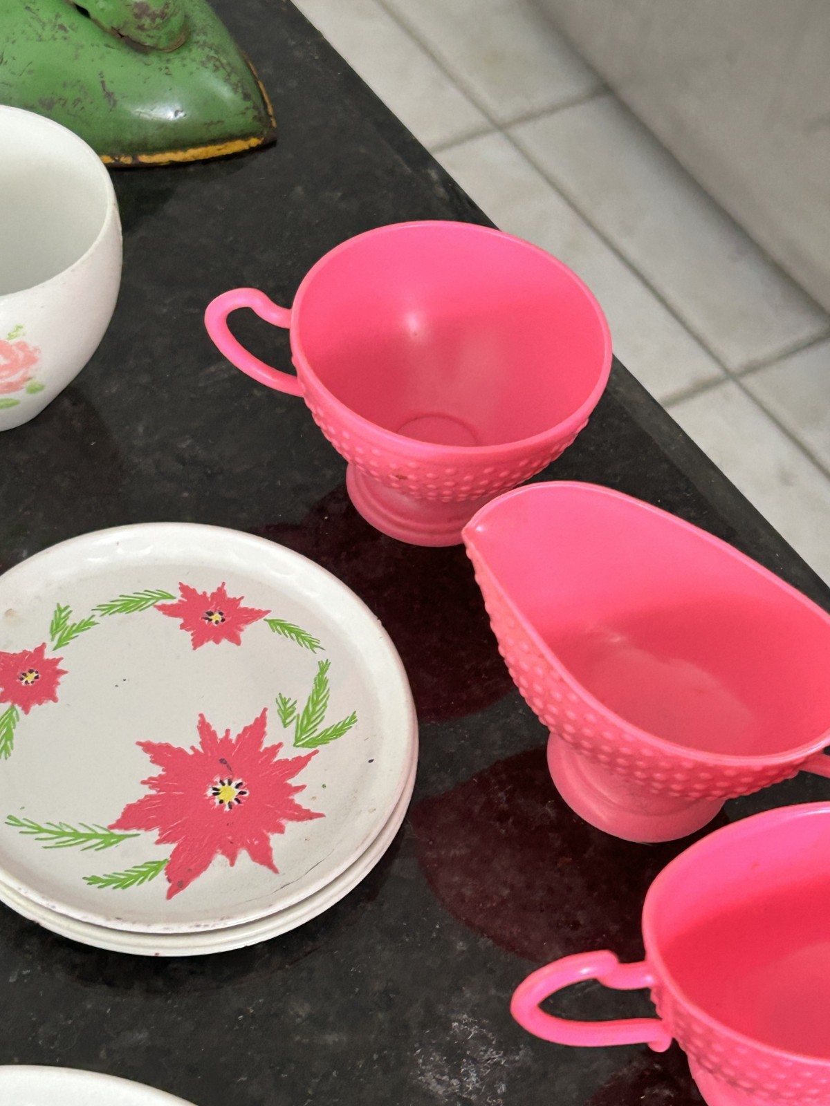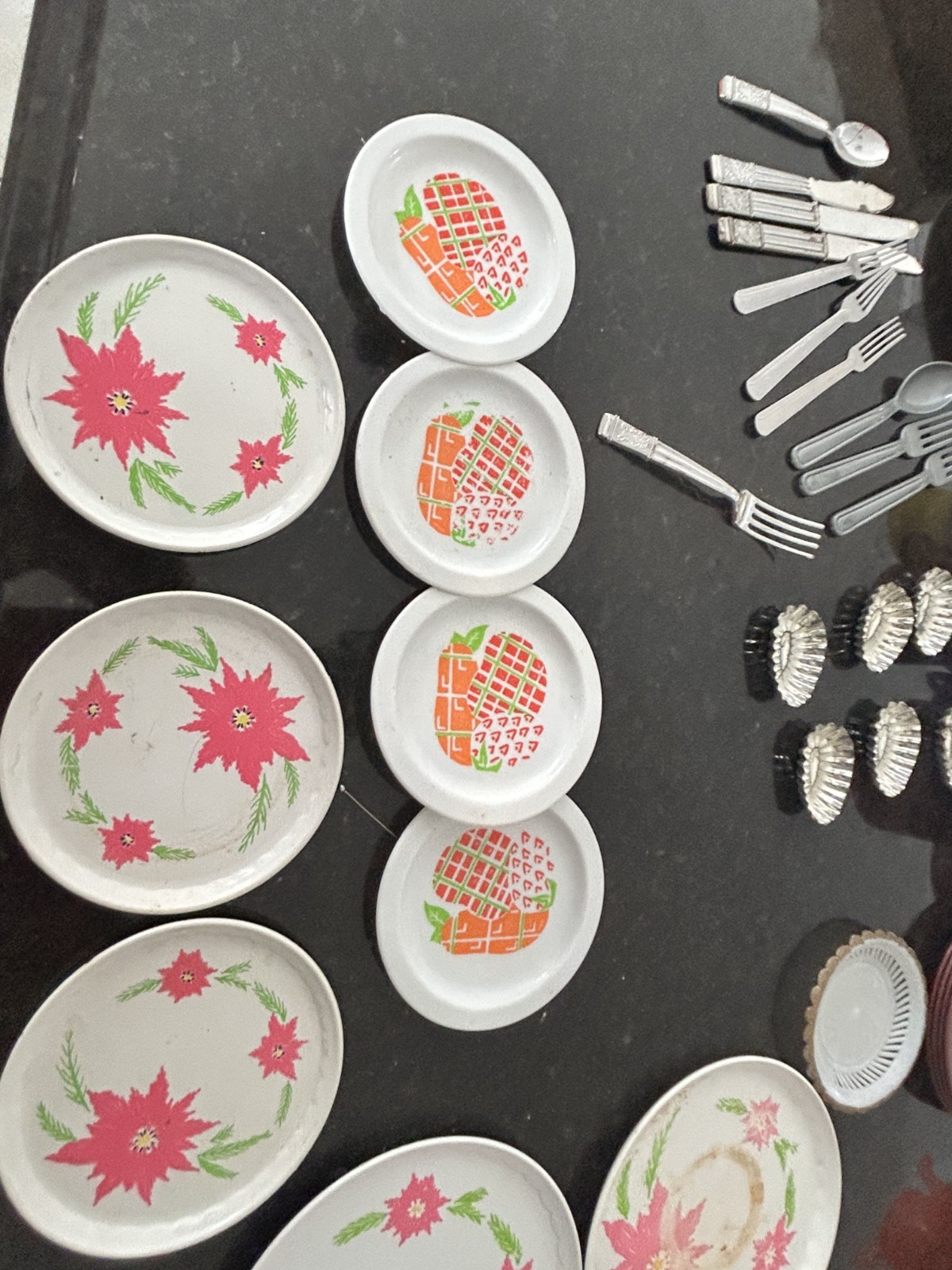 Vintage Toy Dish Set Lot Plates Cups Utensils Pitcher Unmarked w/ Toy Iron