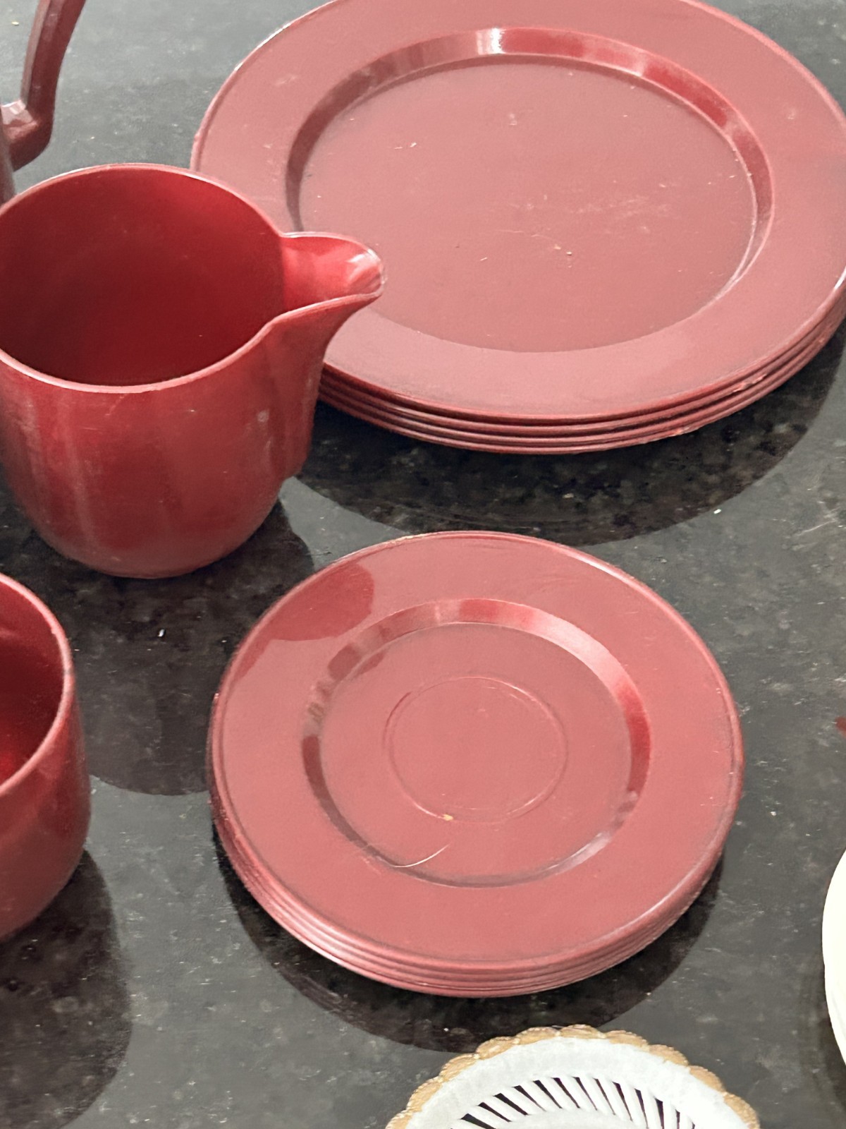 как выглядит Vintage Toy Dish Set Lot Plates Cups Utensils Pitcher Unmarked w/ Toy Iron фото