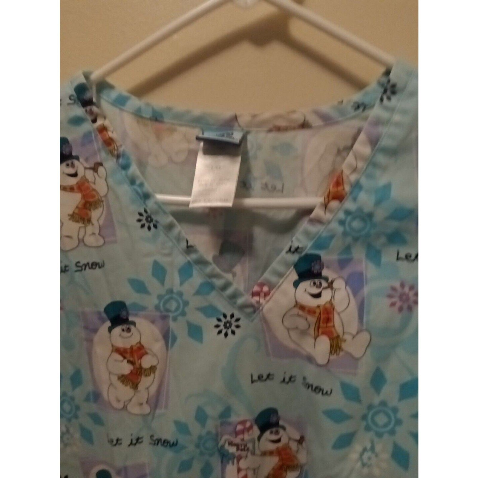 как выглядит Frosty the Snowman Nurse Scrub Shirt Womens Size L All Over Print Christmas VG фото