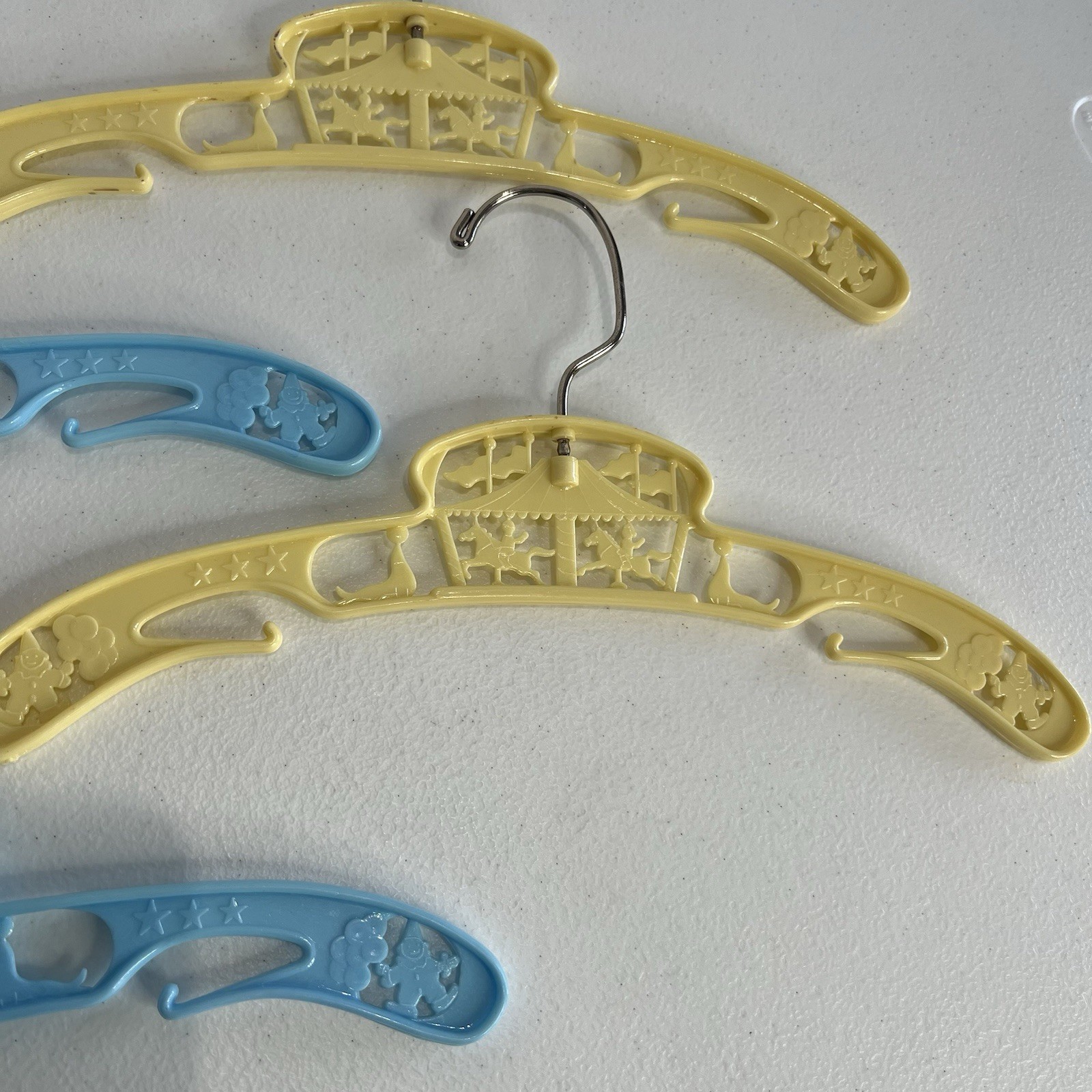 4 Baby World Co Blue Yellow Plastic Child's Hanger Vtg New York 50s 60s Circus