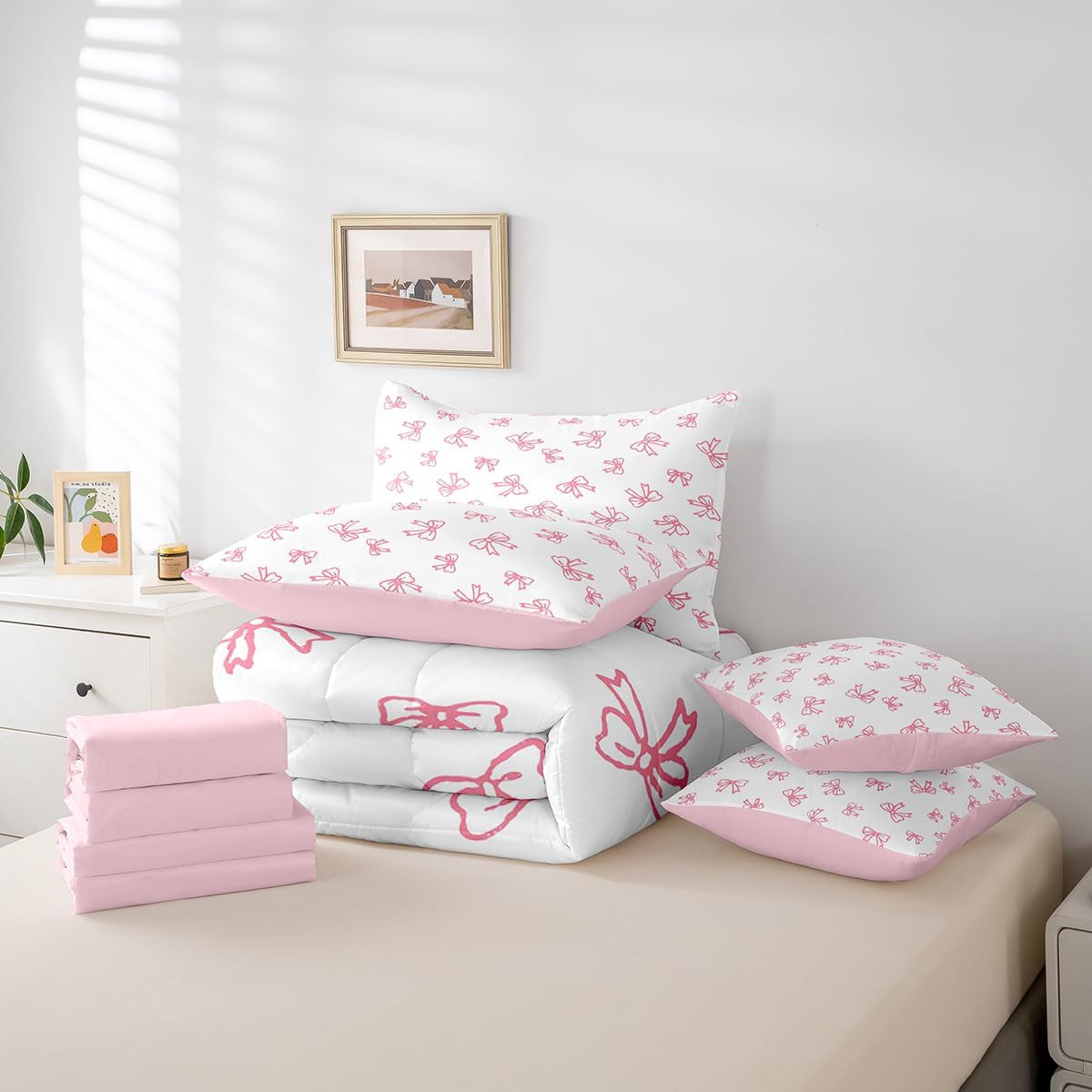 Pink Bow Comforter Set - 7 Piece Full Size Bedding for Girls Teens