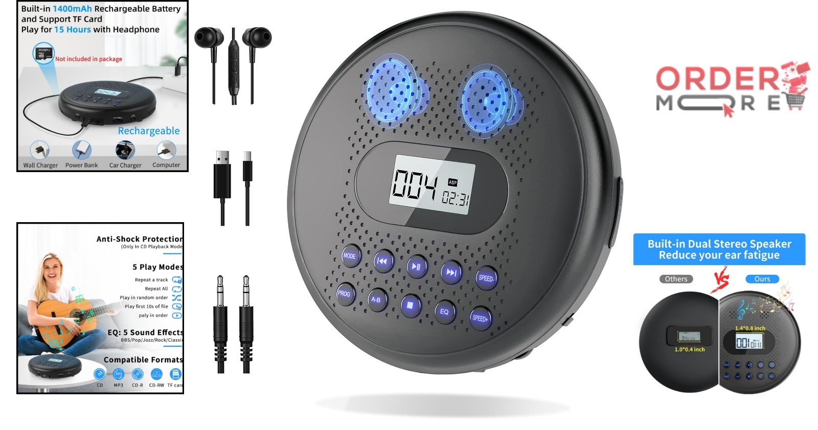 Особенности: Anti-Skip Protection, Rechargeable, Built-in Dual Stereo Speakers, Backlit Display, Larger LCD Display, A-B Repeat, Last Memory, Lightweight, Portable