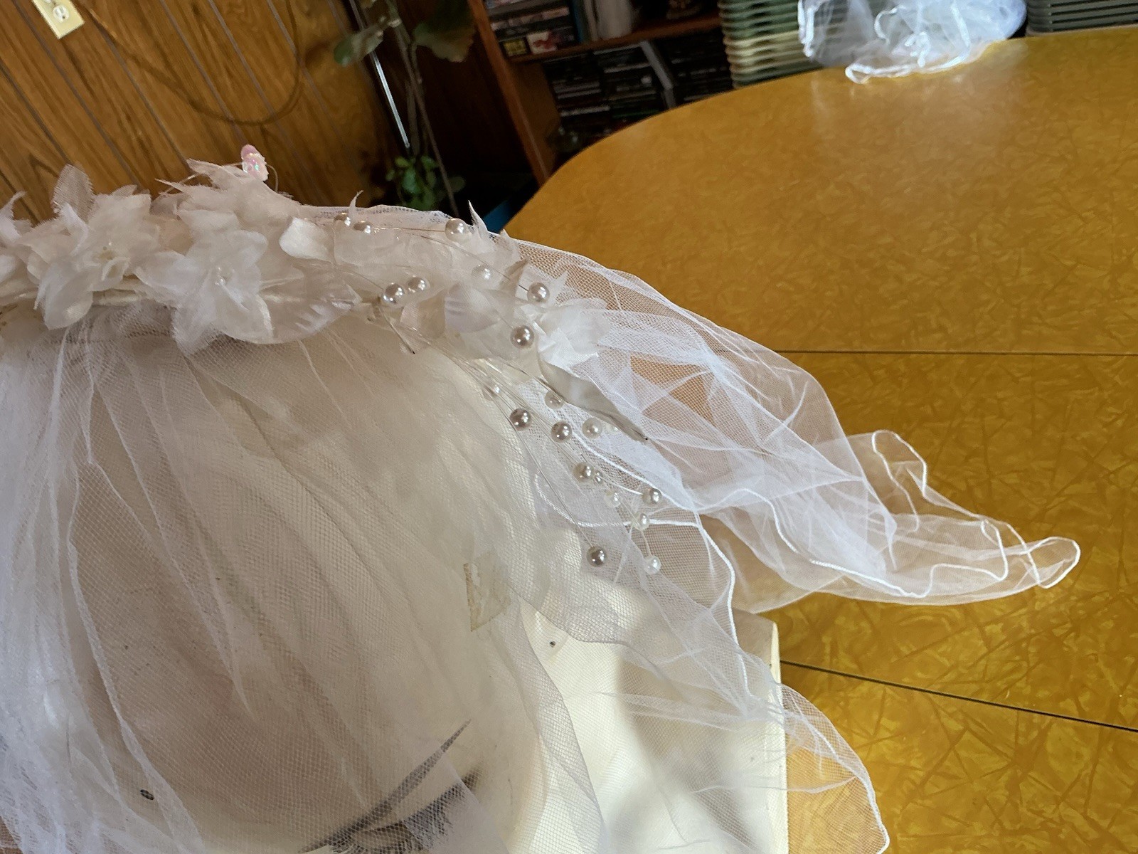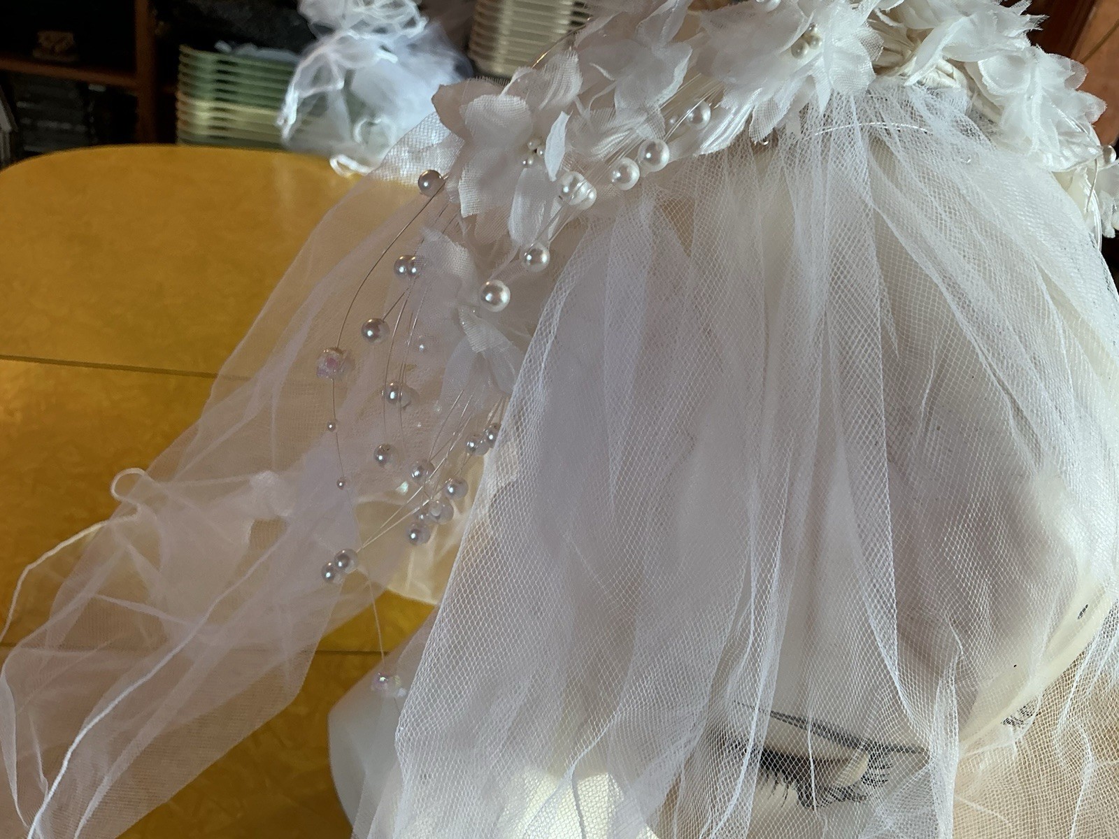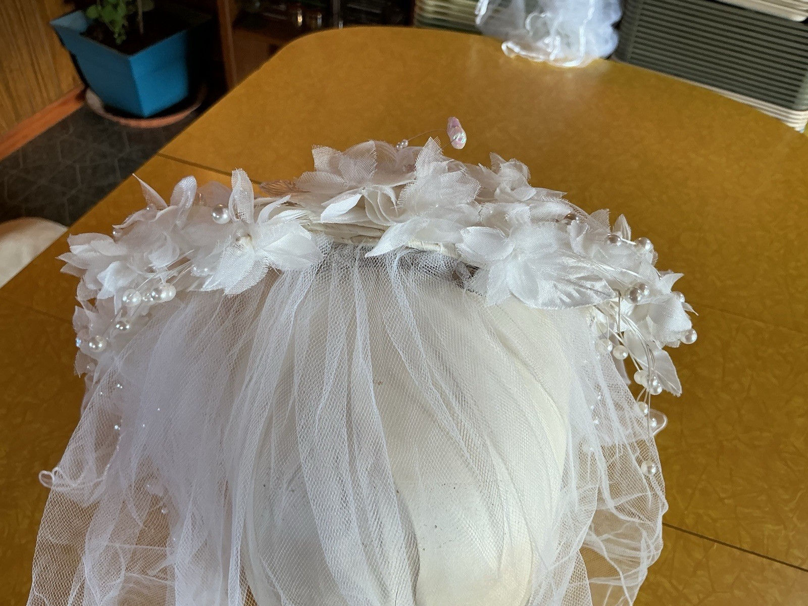 как выглядит Vintage Bridal Veil Floral Crown Headpiece Pearls Beaded Tulle Romantic Wedding фото