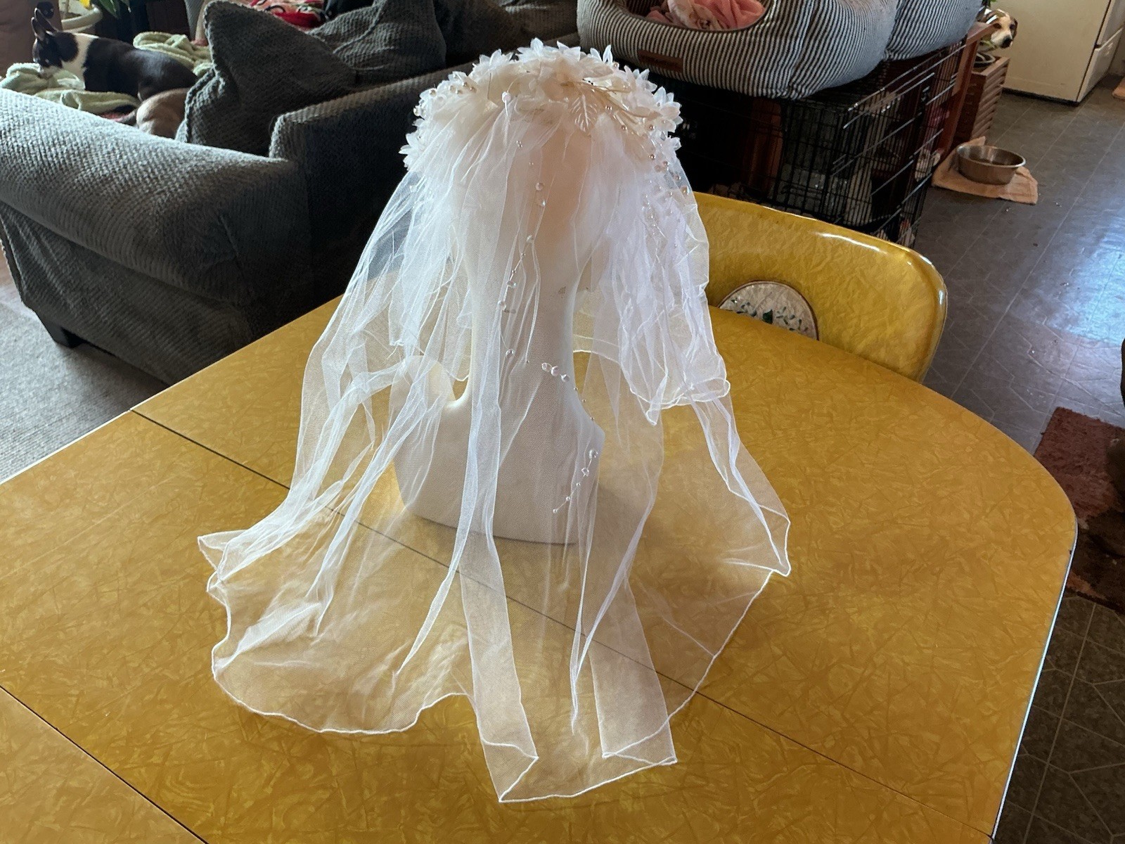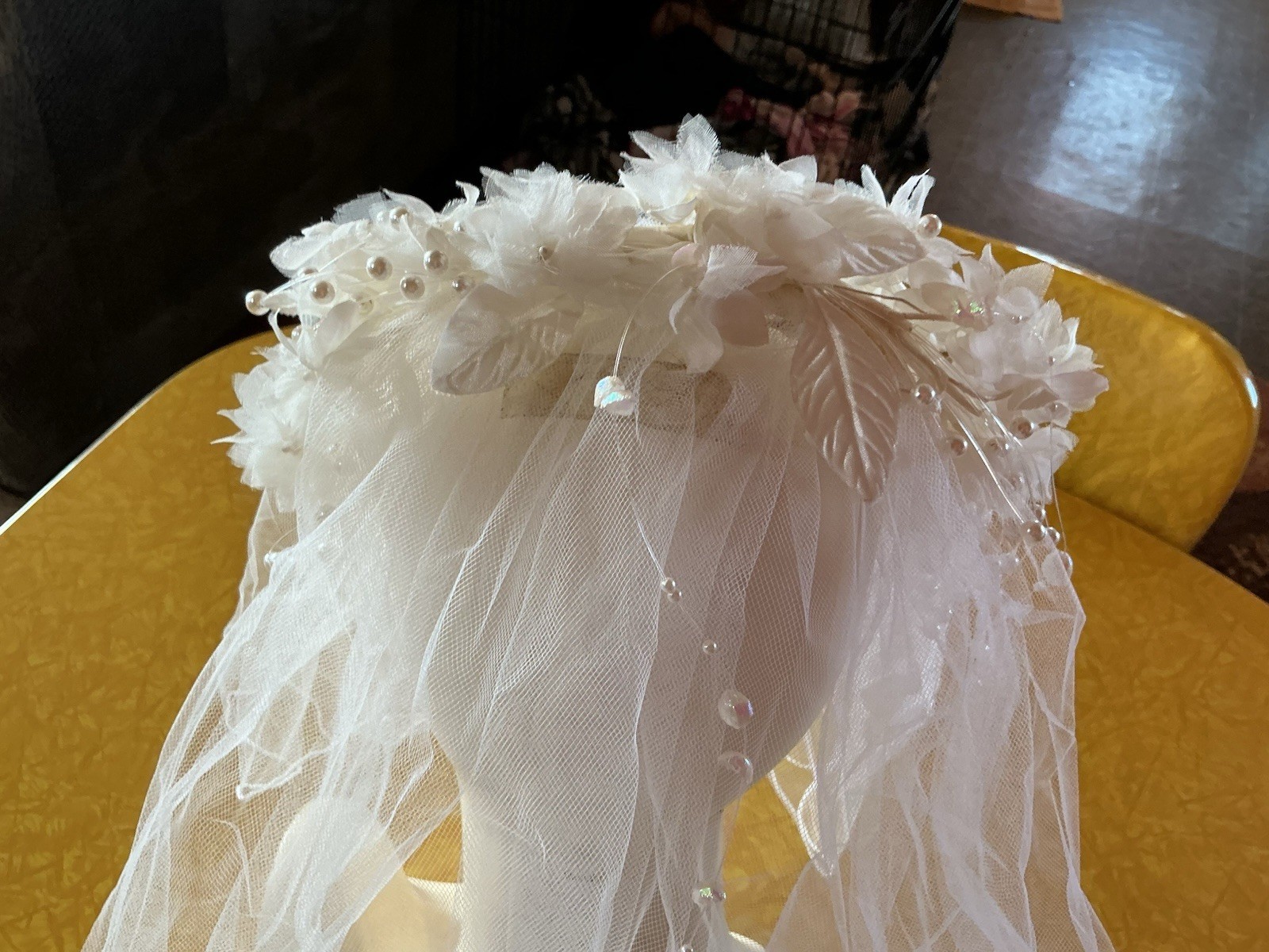 Vintage Bridal Veil Floral Crown Headpiece Pearls Beaded Tulle Romantic Wedding
