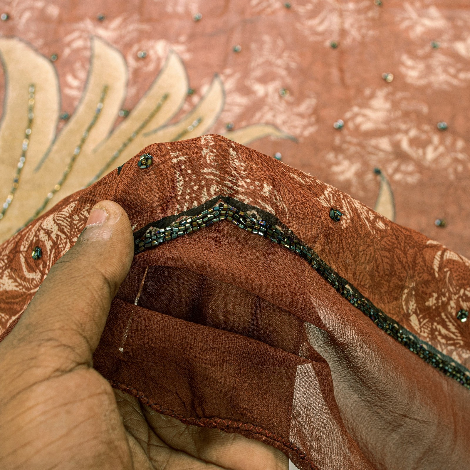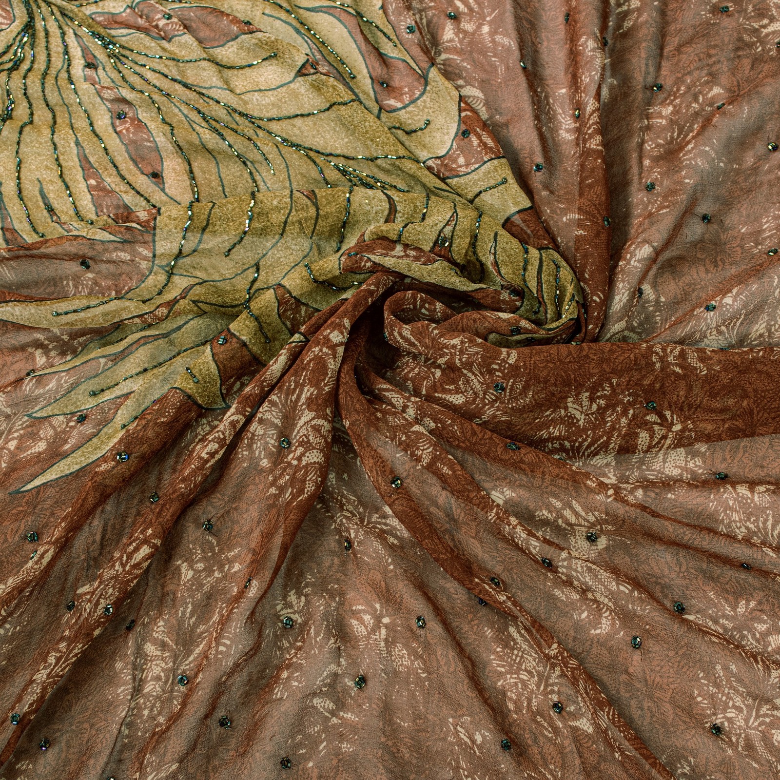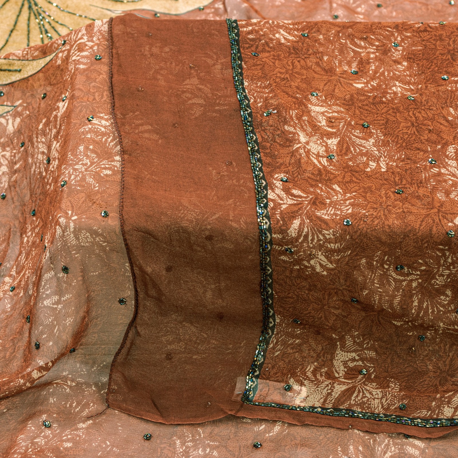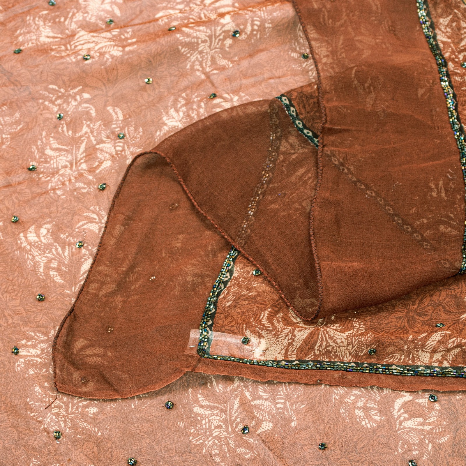 как выглядит Sanskriti Vintage Brown Pure Georgette Dupatta Hand Bead Floral Print Stole Wrap фото